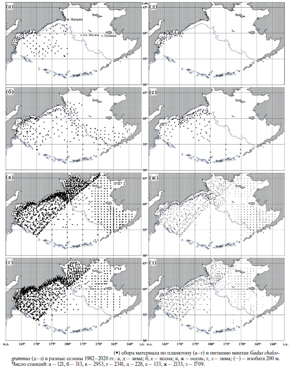 Материал по планктону и питанию минтая собран при выполнении траловых съёмок на судах Базы исследовательского флота ВНИРО в Беринговом море в 1982–2020 гг. (рис. 1). Планктон отлавливали в слое 0–200 м (0 – дно при глубине < 200 м) большой сетью Джеди (площадь входного отверстия 0.1 м², сито с ячеей 0.168 мм) и обрабатывали по единой принятой в ТИНРО методике, с введением поправок на недолов (Волков, 2008а). Скорость подъёма сети составляла 0.7–1.0 м/с. Пробу зоопланктона для удобства обработки разделяли на размерные фракции просеиванием через два сита: № 7 с ячеей 1.2 мм и № 14 с ячеей 0.5 мм. В итоге получали три фракции: мелкую (длина животных 0.6–1.2 мм), среднюю (1.3–3.2 мм) и крупную (3.3–3.5 мм). Для исключения влияния недолова на результаты вводили поправочные коэффициенты: для организмов мелкой фракции – 1.5, средней – 2.0. Для планктона крупной фракции применяли следующие поправочные коэффициенты: для эвфаузиид, мизид (Mysida) и щетинкочелюстных (Chaetognatha) длиной < 10 мм – 2.0, 10–20 мм – 5.0, > 20 мм – 10.0; для гипериид (Hyperiidae) длиной < 5 мм – 1.5, 5–10 – 3.0, > 10 мм – 5.0; для копепод длиной < 5 мм – 2.0, ≥ 5 мм – 3.0; для полихет (Polychaeta), мелких медуз (Cnidaria), крылоногих моллюсков (Pteropoda) и других малоподвижных животных – 1.0.