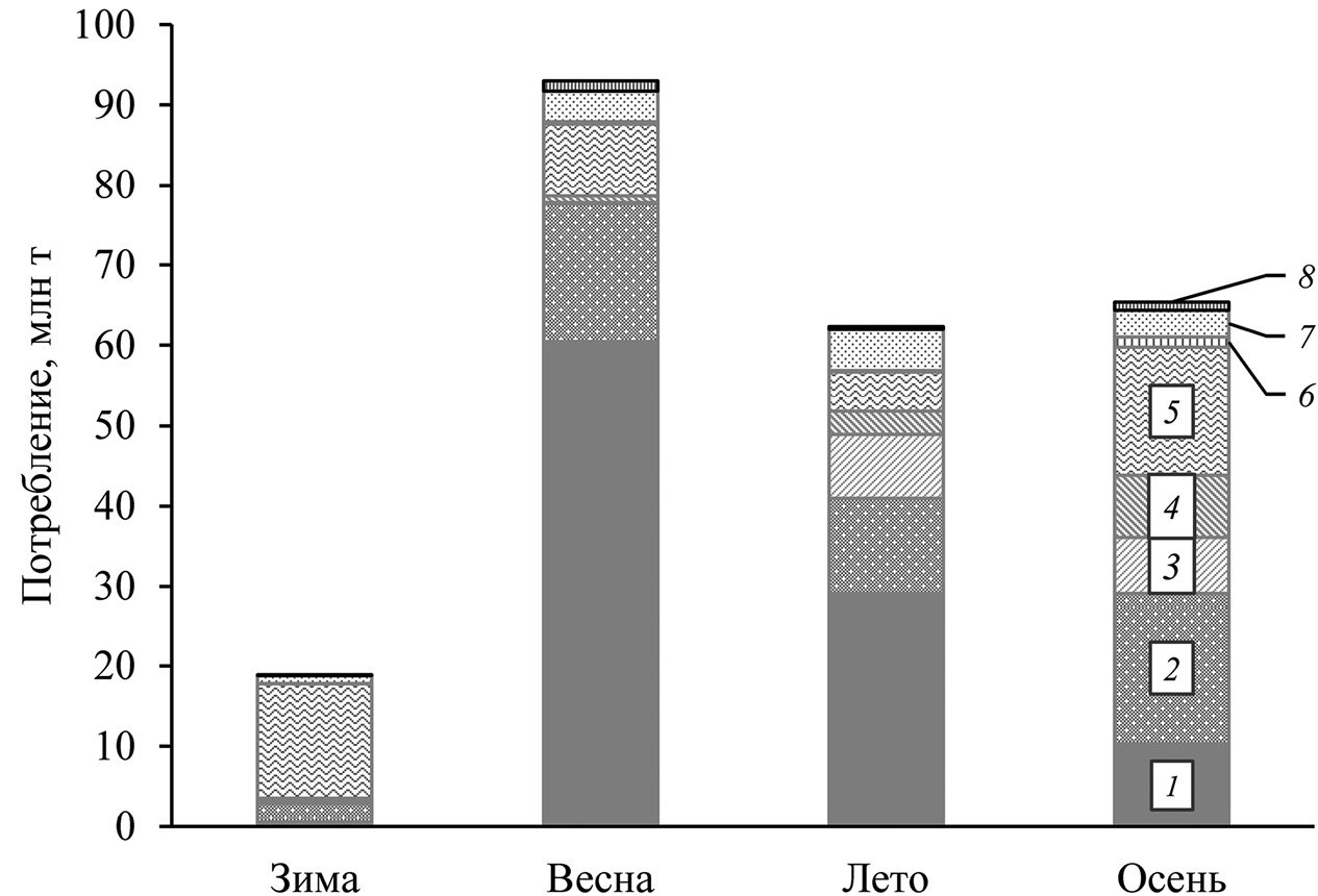 В весенний сезон, являющийся началом вегетативного периода для планктона, а для минтая – началом посленерестового нагула, пятикратно возросло количество потреблённой пищи – 93.0 млн т (рис. 2). Доминирующей группой гидробионтов в питании были новые генерации планктона – 78.6 млн т (84.5%), среди которого значительно выделялись копеподы (65.0%), являющиеся основным источником восстановления понесённых энергетических затрат в период нереста, и эвфаузииды (18.5%). В составе пищи крупноразмерного минтая нектон продолжал занимать значительную долю, что отразилось на общем его потреблении весной, когда выедалось до 9.4 млн т (10.1%) различных видов рыб и кальмаров (табл. 2). Доля бентосной составляющей продолжала оставаться незначительной – 5.1 млн т (5.5%).