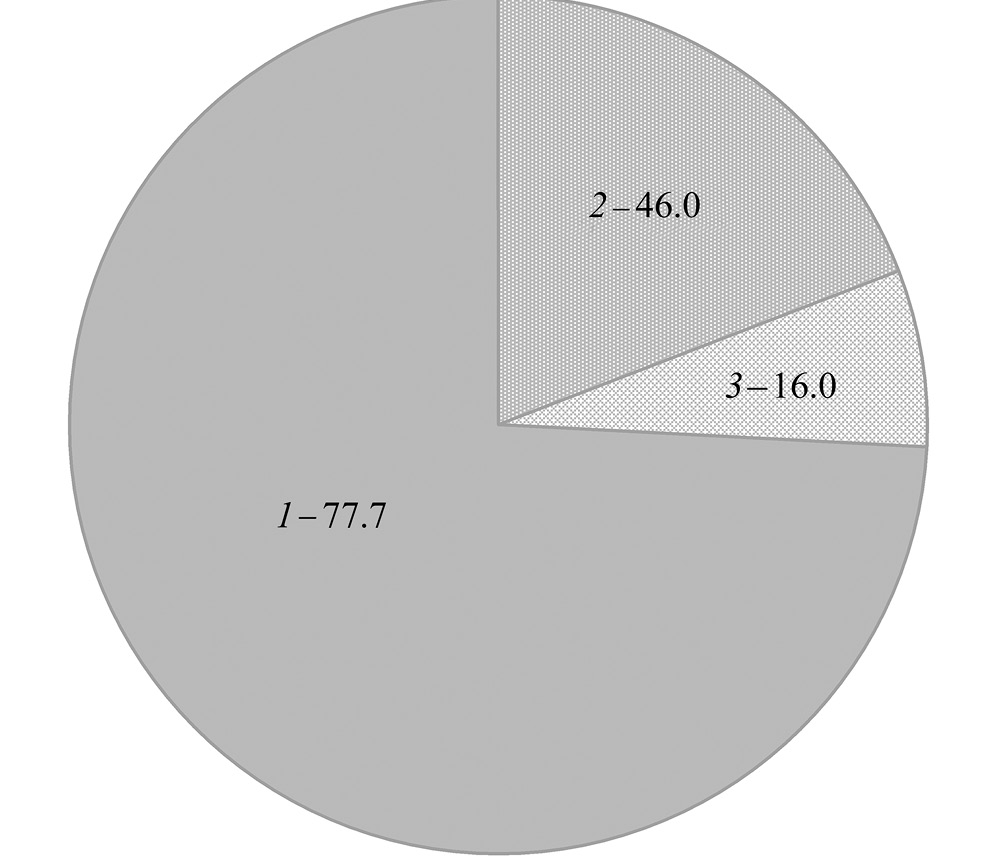 Рис. 6. Среднегодовое потребление (млн т) минтаем Gadus chalcogrammus гидробионтов (доминирующие группы) в эпипелагиали Берингова моря в 2011–2020 гг.: 1 – планктон (73.7%): Copepoda (41.4%), Euphausiacea (20.7%), прочие (11.6%); 2 – нектон (19.7%): Pisces (17.5%), Decapodiformes (2.2%); 3 – бентос (6.6%): Decapoda (5.1%), прочие (1.5%).
