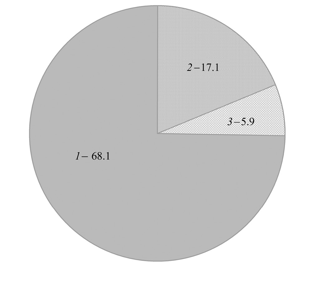 Рис. 3. Среднегодовое потребление (млн т) минтаем Gadus chalcogrammus гидробионтов (доминирующие группы) в эпипелагиали Берингова моря в 1982–2020 гг.: 1 – планктон (74.1%): Copepoda (41.9%), Euphausiacea (20.9%), прочие (11.3%); 2 – нектон (19.2%): Pisces (18.4%), Decapodiformes (0.8%); 3 – бентос (6.7%): Decapoda (5.5%), прочие (1.2%).