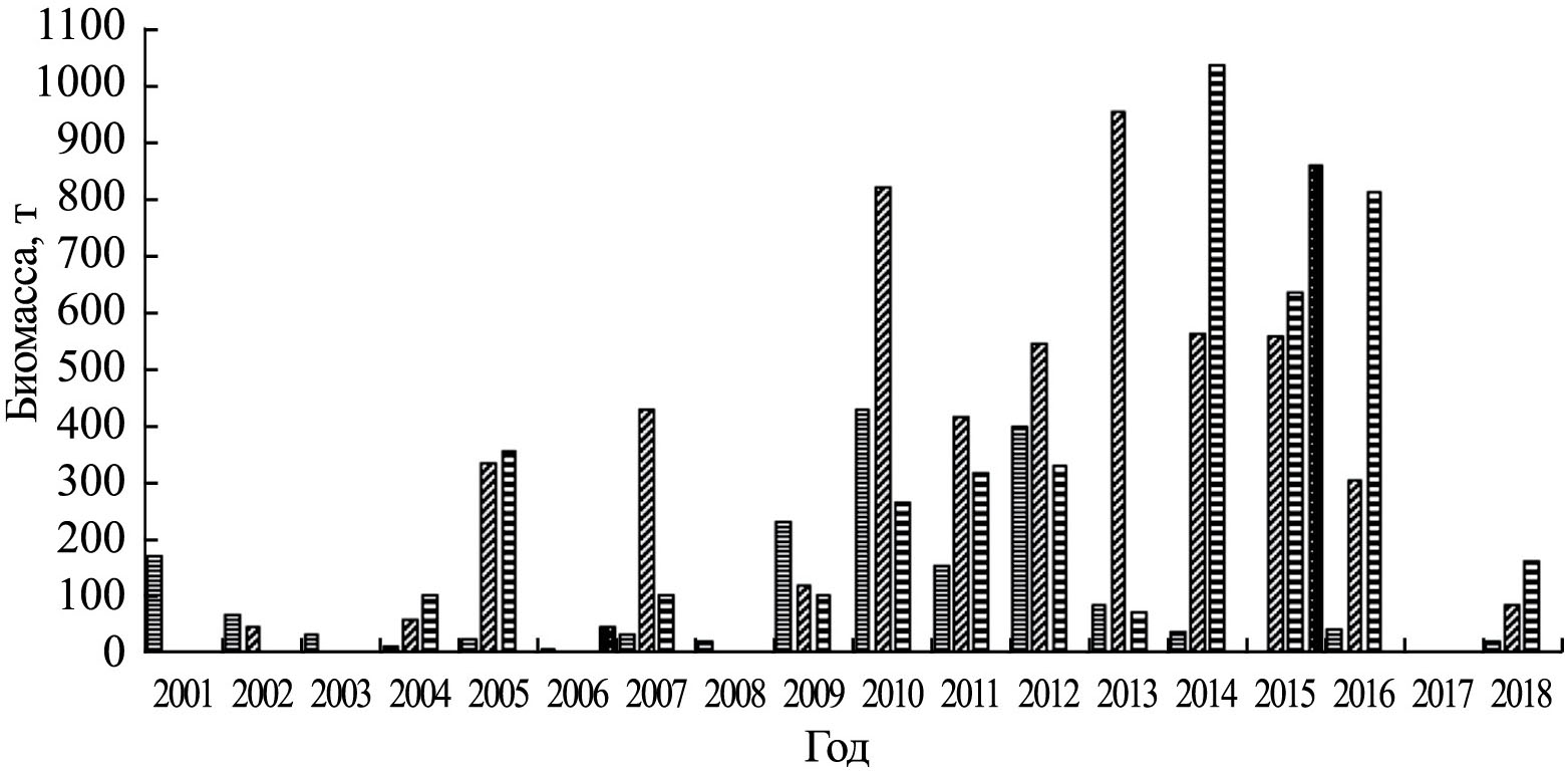 Рис. 6. Многолетняя динамика биомассы кристаллинового липариса Crystallias matsushimae в разных районах северо-западной части Японского моря по данным донных траловых съёмок: (▤) – зал. Петра Великого, (▨) – Северное Приморье, (◧) – Татарский пролив, (■) – Западный Сахалин.