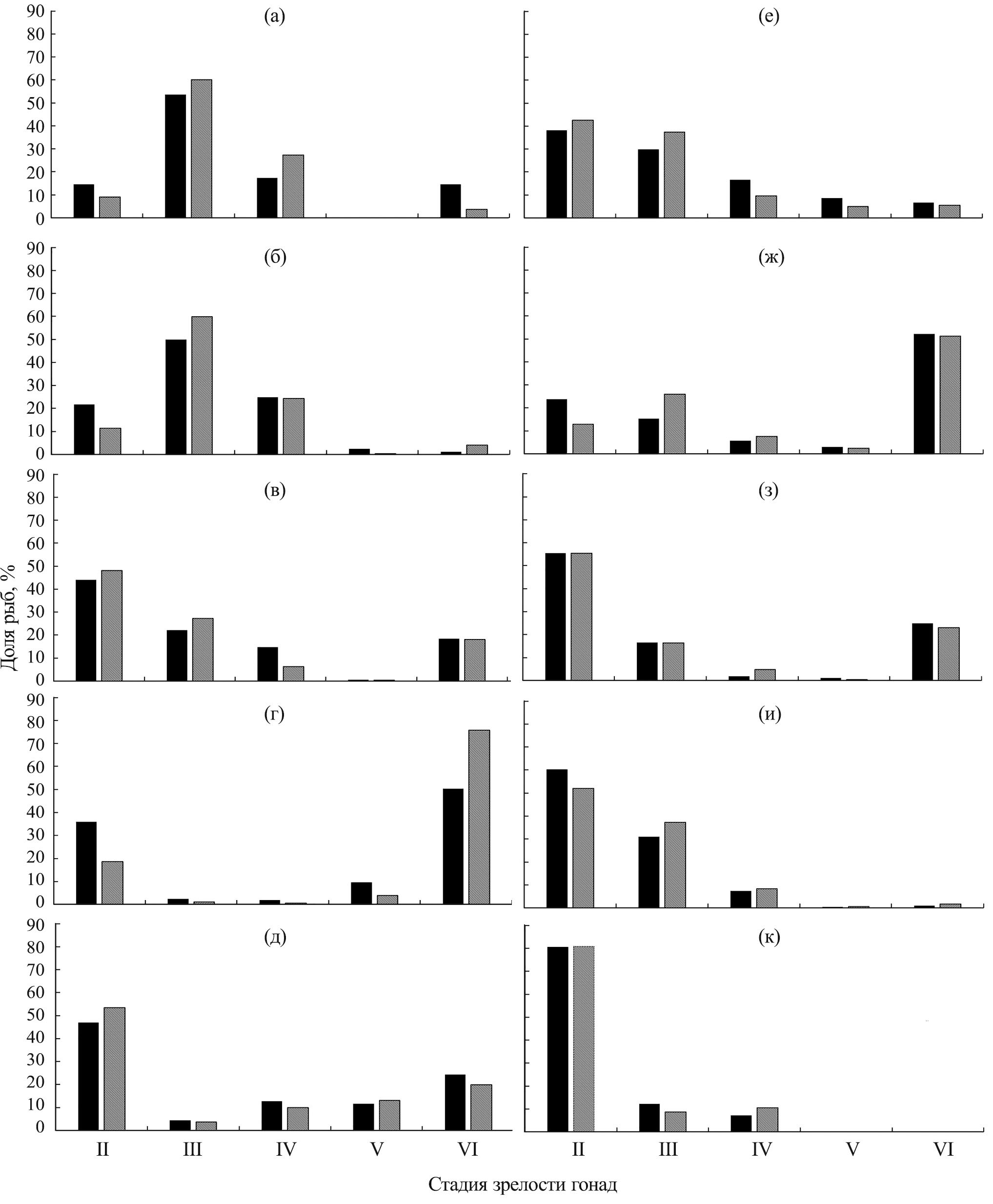 Рис. 2. Сезонное изменение соотношения в Центрально-Восточной Атлантике самцов (■) и самок (■) африканской скумбрии Scomber colias с гонадами разных стадий зрелости в 2004–2017 гг.: а – февраль, б – март, в – апрель, г – май, д – июнь, е – июль, ж – август, з – сентябрь, и – октябрь, к – ноябрь.