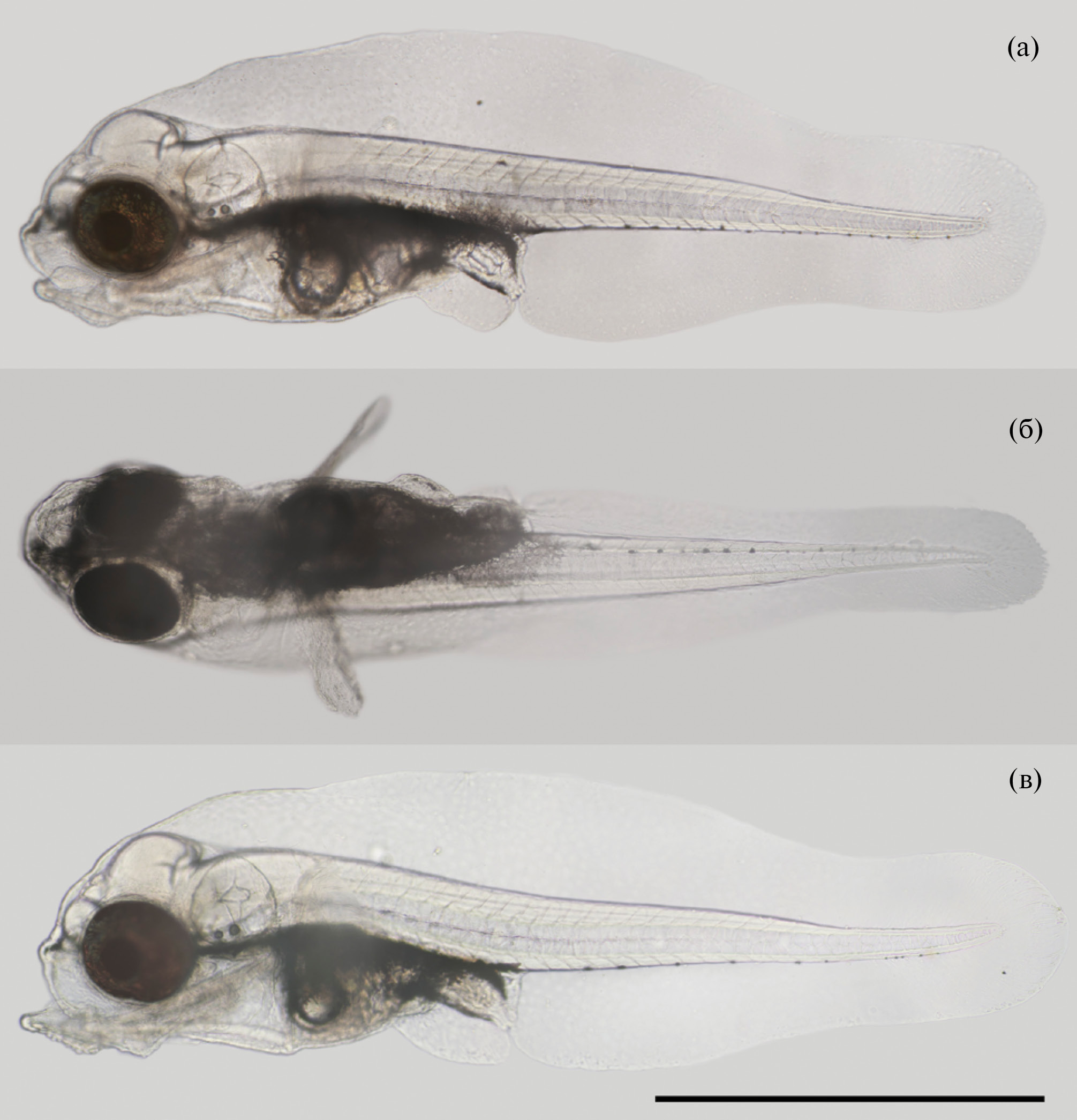 Рис. 5. Предличиночное и личиночное развитие Monodactylus argenteus: а – предличинка TL 2.53–2.66 мм, возраст 63–68 ч после вылупления (п.в.); б – другая предличинка примерно этого же возраста, вид с вентральной стороны; в – личинка, перешедшая на смешанное питание, TL 2.54–2.65 мм, ~80 ч. п.в. Масштаб (линейка общая): 1 мм.