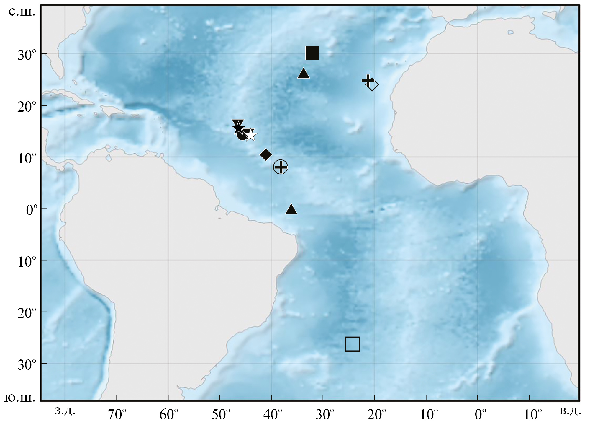 Рис. 1. Места поимок Melamphaidae: (●) — Melamphaes leprus, (○) — M. polylepis, (■) — M. inconspicuus, (□) — M. lentiginosus, (▲) — M. pumilus, (△) — M. typhlops, (◇) — Poromitra megalops, (◆) — P. macrophthalma, (▼) — Scopeloberyx robustus, (✚) — S. opisthopterus, (✩) — Scopeloberyx sp., () — Scopelogadus mizolepis.