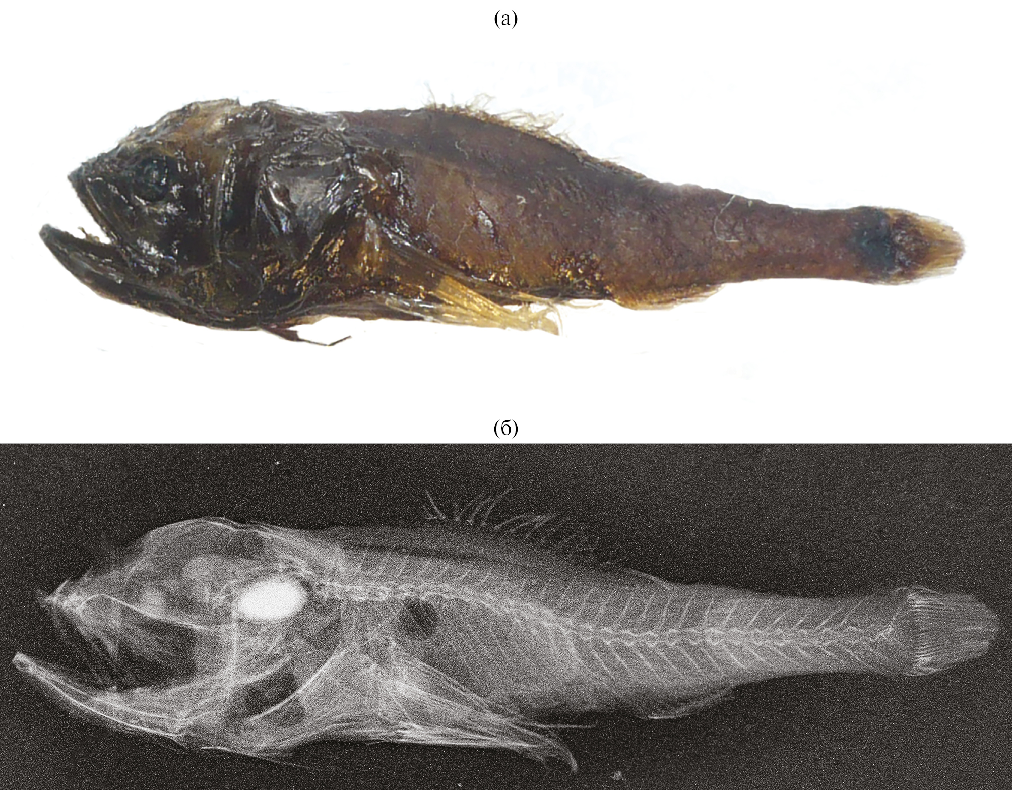 Рис. 2. Melamphaes leprus SL 17.5 мм: а – внешний вид, б — рентгенограмма.