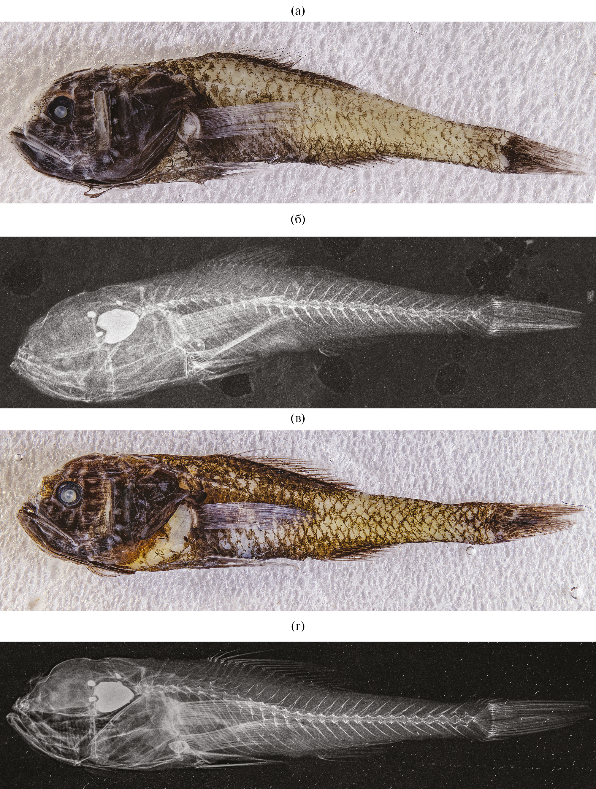 Рис. 4. Melamphaes lentiginosus: а, б — SL 14.0 мм; в, г — SL 22.0 мм; а, в – внешний вид; б, г — рентгенограмма.