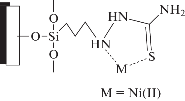 The adsorption of nickel(II) ions by natural aluminosilicate modified with hydrochloric acid followed by immobilization of 1-(3-triethoxysilylpropyl)thiosemicarbazide (TSC) has been studied. The AS–HCl–TSC Series of adsorbents was obtained by treating AS–HCl with solutions TSC with a concentration of 0.5, 1.0, 1.8, 3.5, 4.5, 5.8 wt %. The adsorption capacity of the obtained samples was studied in relation to nickel(II) ions. The highest adsorption of nickel(II) ions, 165.7 mg/g, corresponds to the sample treated with a solution containing 1% TSC. A subsequent increase in the concentration of the modifier leads to a decrease in the amount of adsorption. It can be assumed that with an increase in the concentration of the modifier, the support surface is covered with a denser TSC layer. In this case, the internal volume of the carrier does not participate in exchange processes, which, in turn, contributes to a decrease in the adsorption value with an increase in the concentration of the modifier. The adsorption equilibrium corresponding to the constancy of the composition of the concentrations of metal ions in the adsorbate–aluminosilicate AS–HCl–TSC system was 90 min. For the AS–HCl–TSC adsorbents obtained, the adsorption kinetics of nickel(II) ions was studied. Kinetic equations of pseudofirst and pseudosecond orders are obtained. The values of the determination coefficients (0.98–0.99) indicate that the adsorption of nickel(II) ions by the AS–HCl–TSC adsorbent can be described by a pseudo-second-order equation. At concentration 1% TSC modifier, the initial adsorption rate of nickel(II) ions was 0.121 mmol/(g min). In this case, the value of the adsorption-rate constant is 0.082 g/(mmol min). For AS, AS–HCl, AS–TSC, and AS–HCl–TSC samples, the adsorption capacity was 5.9 mg/g (0.10 mmol/g), 11.6 mg/g (0.20 mmol/g), 16.6 mg/g (0.28 mmol/g), and 165.7 mg/g (2.8 mmol/g), respectively.