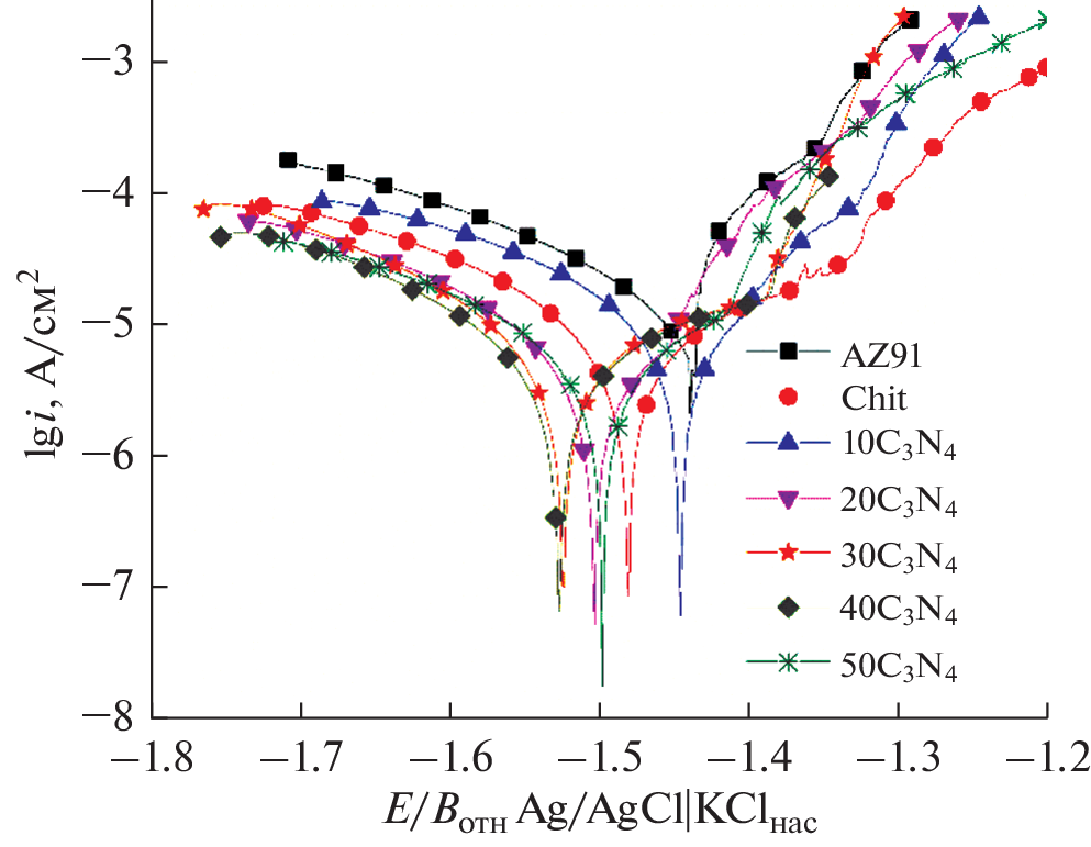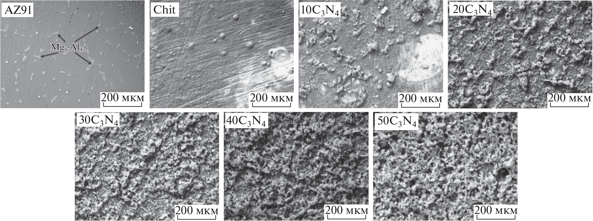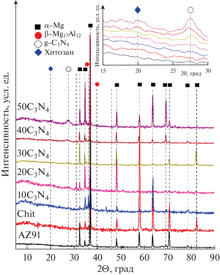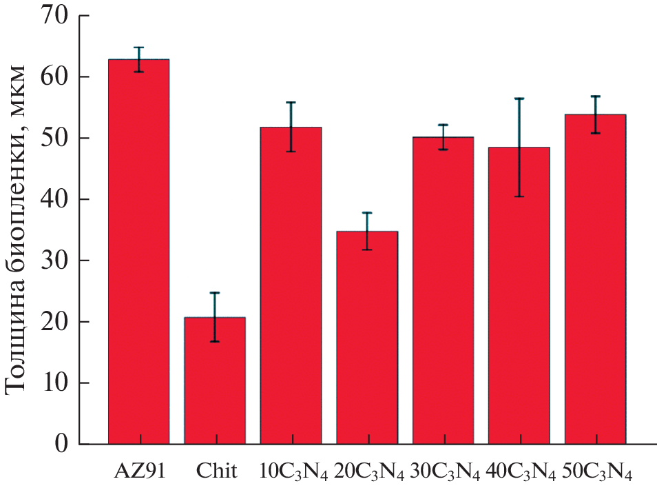 In the present study, chitosan coatings modified with g-C3N4 were prepared for AZ91 magnesium alloy. The microstructure of the chitosan–g-C3N4 coatings, depending on the concentration of the particles of the modifying phase in the chitosan solution, was investigated by scanning electron microscopy and X-ray phase analysis. It was found that coatings prepared in suspension of chitosan containing more than 30 g/dm3 g-C3N4 exhibited a complete wettability with a sodium-phosphate buffer solution. Confocal microscopy established the degree of inhibition of E. coli biofilm formation on the surface of the prepared coatings. It was found by using linear voltammetry and electrochemical impedance spectroscopy that the modification of chitosan by the g-C3N4 particles led to an improvement in the protective properties of coatings.