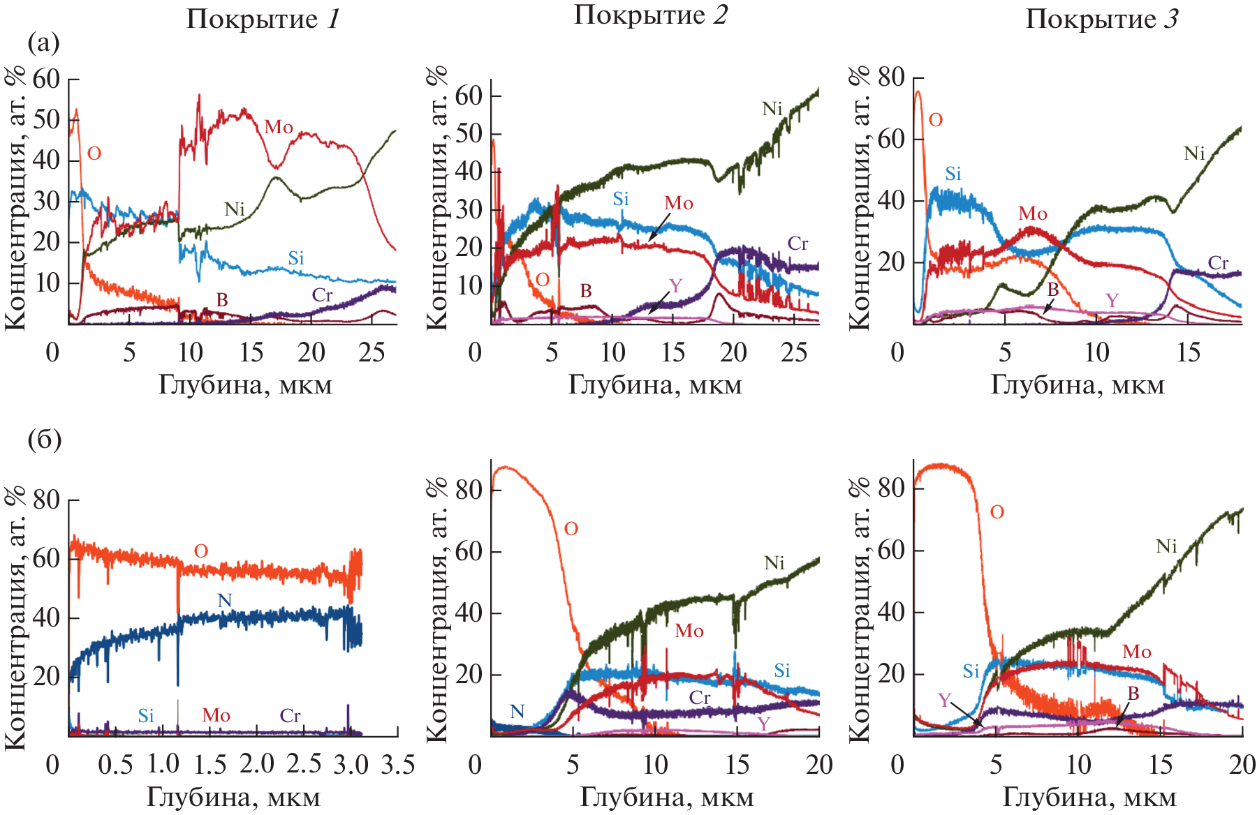The Mo–Si–B and Mo–Y–Si–B coatings were obtained by magnetron sputtering in the direct-current mode using a 90% MoSi2 + 10% MoB target equipped with yttrium segments. The composition and structure of the coatings were studied by scanning electron microscopy, X-ray phase analysis, and optical emission spectroscopy of a glow discharge. The diffusion-barrier properties and heat resistance were evaluated by annealing at temperatures from 700 to 1000°C. The thermal stability was determined by heating the coating lamellae in a column of a transmission electron microscope in the in situ mode. According to the chemical analysis, the main elements were evenly distributed over the thickness of the coatings. The coating growth rate did not change upon the introduction of yttrium and was in the range of 325–350 nm/min. The Mo–Si–B coating was characterized by a columnar structure with grains of the hexagonal phase h-MoSi2 about 50 nm in size, as well as an insignificant volume fraction of the boron-containing amorphous phase (a‑MoB). An increase in the concentration of Y up to 4 at % led to a decrease in the size of h-MoSi2 crystallites of up to 10 nm. A coating with a maximum concentration of yttrium (7 at %) contained predominantly an amorphous phase a-MoB with phase crystallites dispersed in it h-MoSi2 and t-MoB. The introduction of the optimal amount of yttrium (4 at %) led to a decrease in the thickness of the oxide film by a factor of 6 after annealing at a temperature of 800°C and by three times at 900–1000°C. The coating with the maximum concentration of yttrium (7 at %) had the best diffusion-barrier properties of all the studied samples at 700–1000°С, and also surpassed the Mo–Si–B sample in terms of thermal stability. Positive effects from the introduction of yttrium into the composition of the coatings were connected with (a) structure modification, including suppression of columnar grain growth; (b) transition to a structure with a higher volume fraction of the amorphous phase; (c) isolation of grain boundaries and lengthening of the diffusion path of metal atoms from the substrate; and d) formation of protective surface layers on based on yttrium oxide when heated in air.