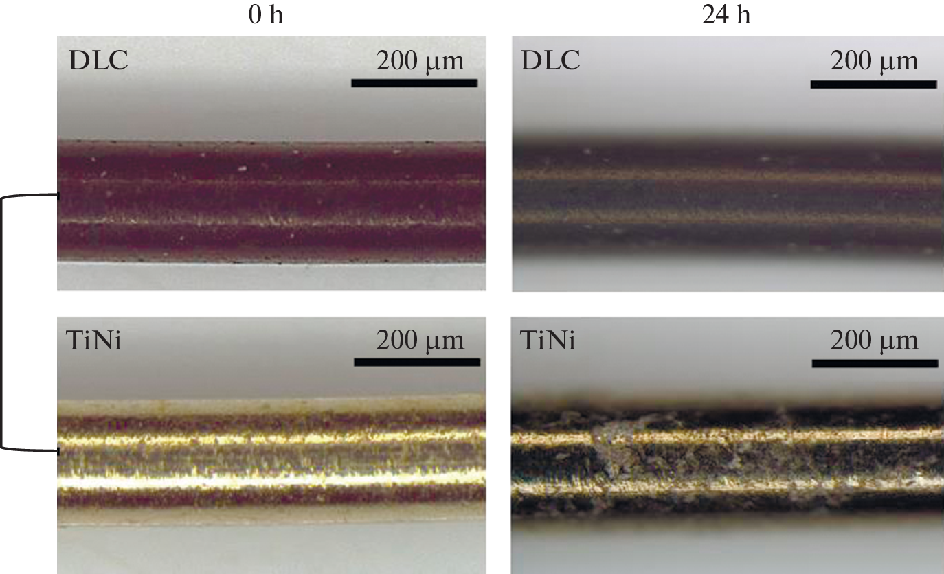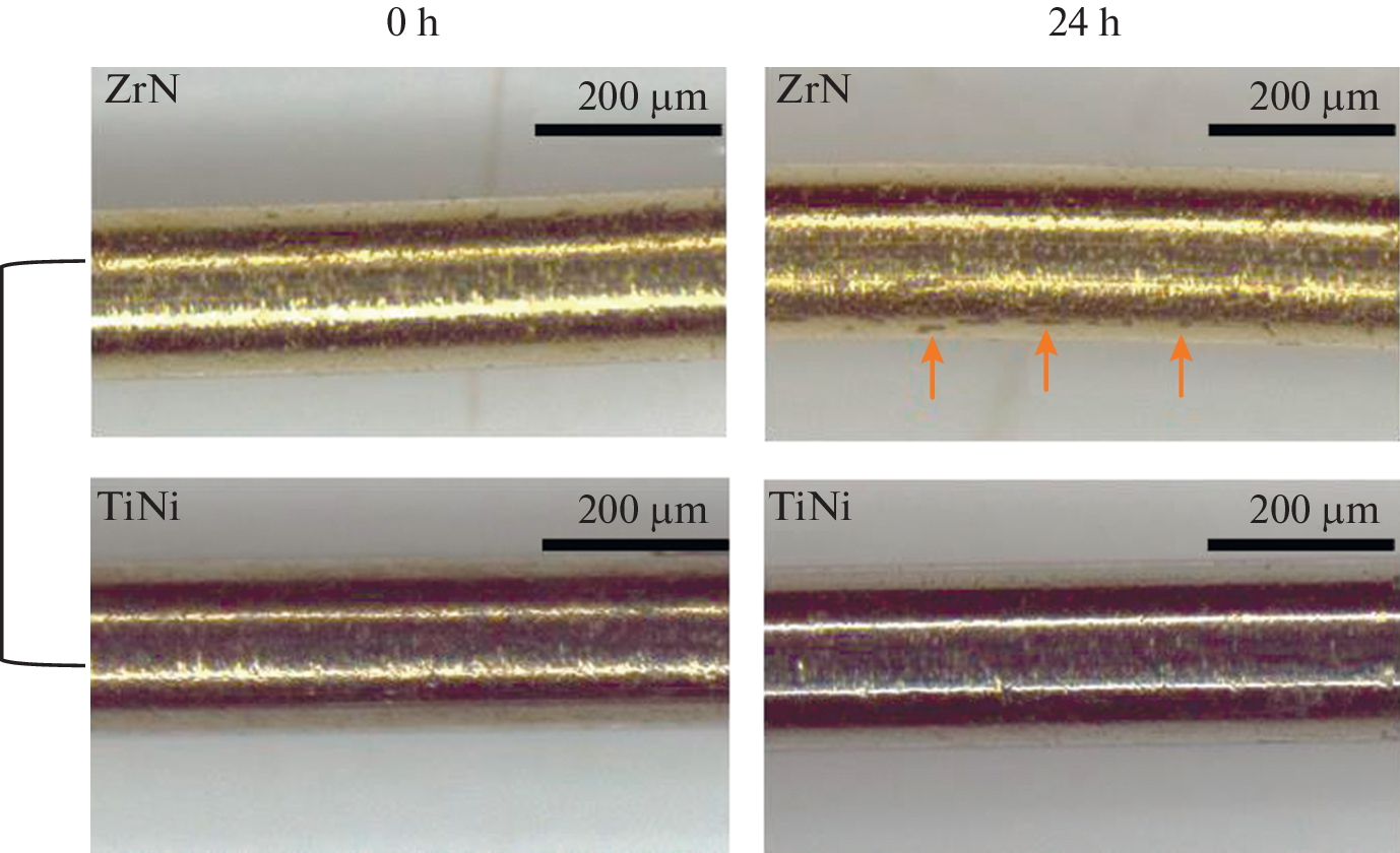 A comparative analysis of the barrier properties and corrosion resistance of bioinert coatings of tantalum, zirconium nitride, stainless steel of the 12X18H10T grade, as well as diamond-like coating (DLC) deposited on the surface of the medical alloy Ti–50.8 at % Ni (TiNi) has been performed. All the coatings are characterized by high barrier properties with respect to the yield of nickel in the biological medium for a long time, whereas, in the case of uncoated TiNi, the concentration of nickel in the test solution increases rapidly and exceeds the permissible amount of migration after 60 days of exposure. Electroplating TiNi–bioinert-coating pairs demonstrate a corrosive behavior determined by the nature of the coating material. The most resistant to galvanic corrosion is the TiNi –Ta pair, for which no signs of corrosion processes were detected on any of the elements of the pair after exposure in a model solution for 24 h. The pairs TiNi–12X18H10T and TiNi–DLC have shown the worst corrosion resistance among the studied pairs: extensive corrosion areas were observed on one of the elements of the pairs.