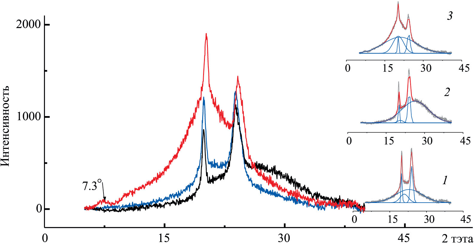Рис. 2. Дифрактограммы образцов мембраны ММК-045 (вставка – результат деконволюции дифрактограмм образцов: 1 – нерабочего; 2 –водонасыщенного; 3 – рабочего).