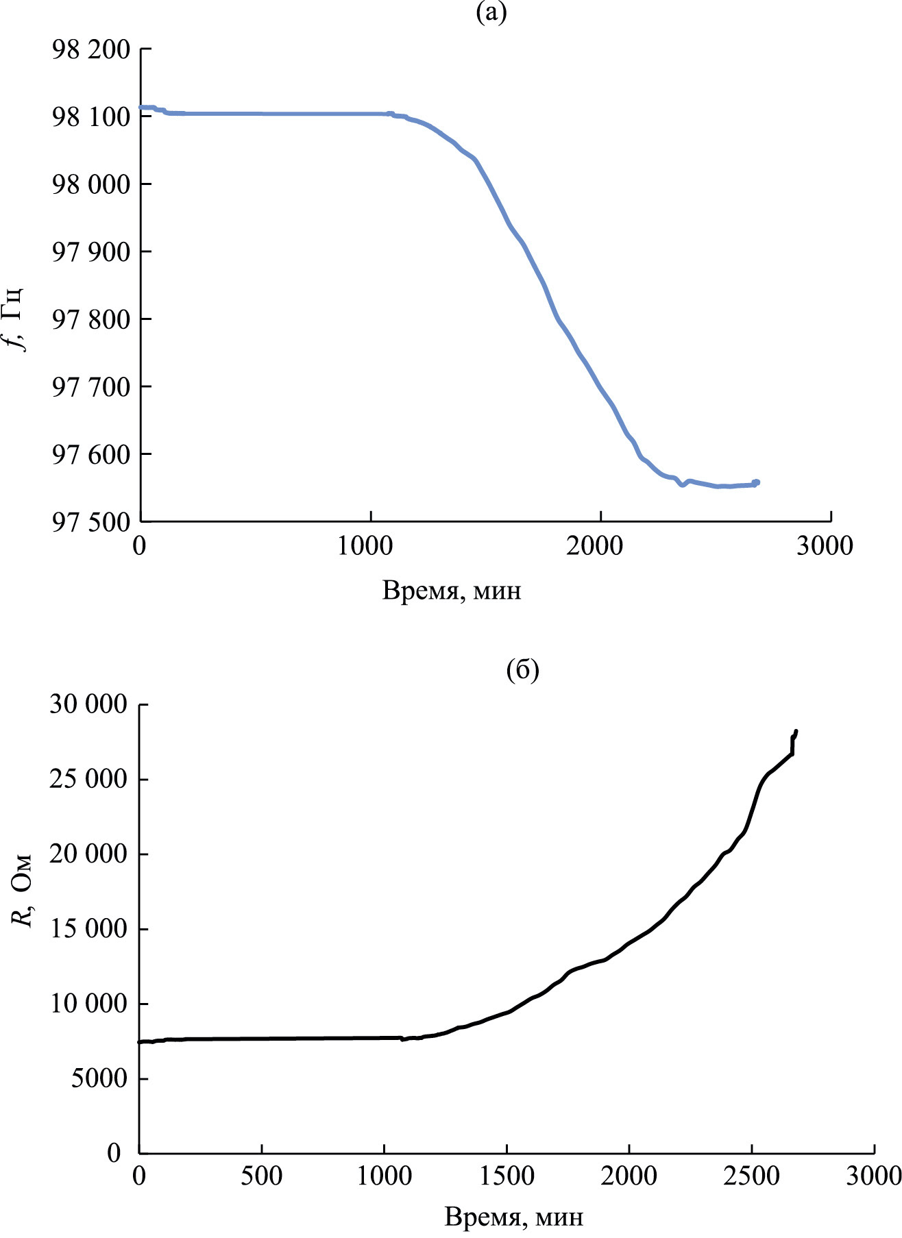 На рис. 6 показан характер изменений частоты и сопротивления сенсора на протяжении всех 3-х дней испытаний. Как видно из графиков, сопротивление выросло в 4 раза и не вернулось к исходному значению, что указывает на существенное увеличение механических потерь и изменение структуры образца.
