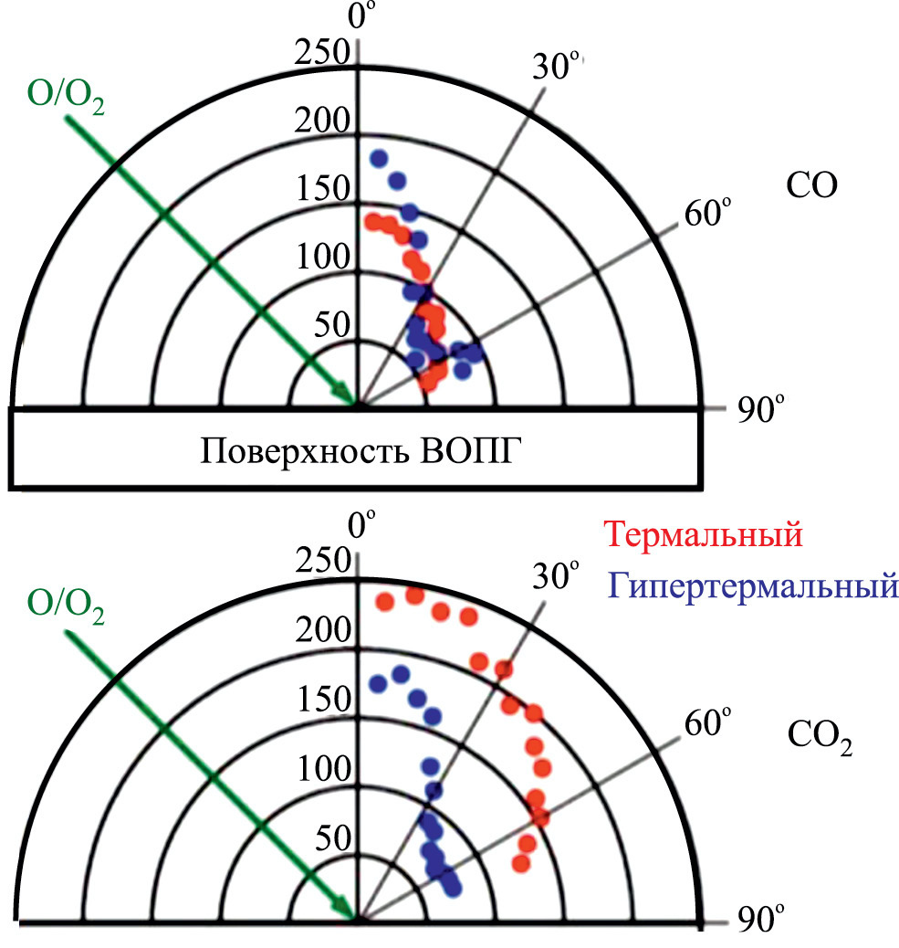 Рис. 2. Относительный поток рассеянного СО и СО2 (красные при нагреве, синие холодные).