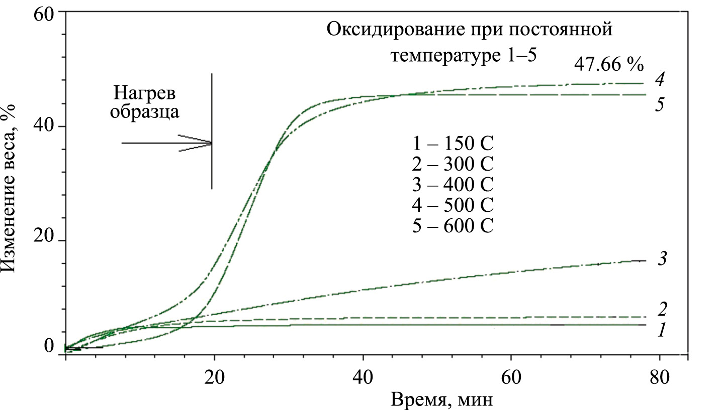 Дальнейший нагрев (рис. 2) не приводил к существенному изменению массы образца, что было связано с полным окислением частиц.