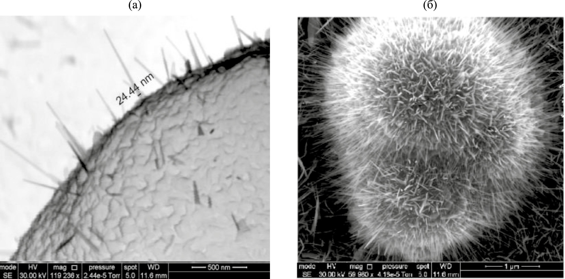 При проведении термогравиметрического анализа [11] было показано, что образцы, оксидируемые при температурах 150° и 300°С показали небольшие скорости изменения массы с практически нулевой скоростью после достижения рабочих температур, связанные очевидно с быстрой пассивацией поверхности металла (рис. 1). Отжиг частиц при температуре начиная с 300°С приводил к росту их шероховатости, связанной с формированием неоднородного слоя оксидных зерен. Из этого слоя под большим увеличением наблюдаются вертикально выступающие ростки нанолистьев и усов (рис. 2а). Образец, оксидируемый при 400°С, показал практически неизменную скорость оксидирования. Очевидно, что оксидный слой, формирующийся на поверхности частиц по линейному закону, не являлся плотным, и процесс протекал с минимальными диффузионными затруднениями, что характерно для окисления с ростом сильно дефектного или пористого оксидного слоя. Особенностью образцов, окисленных при 500°С и выше был четко наблюдаемый рост преимущественно вертикально ориентированных нанолистьев (nanobelts) и наноусов (nanowires), формирующих с ростом времени и температуры окисления “шевелюру” наноусов (рис. 2б). Поверхностная плотность усов заметно росла с температурой и временем оксидирования.