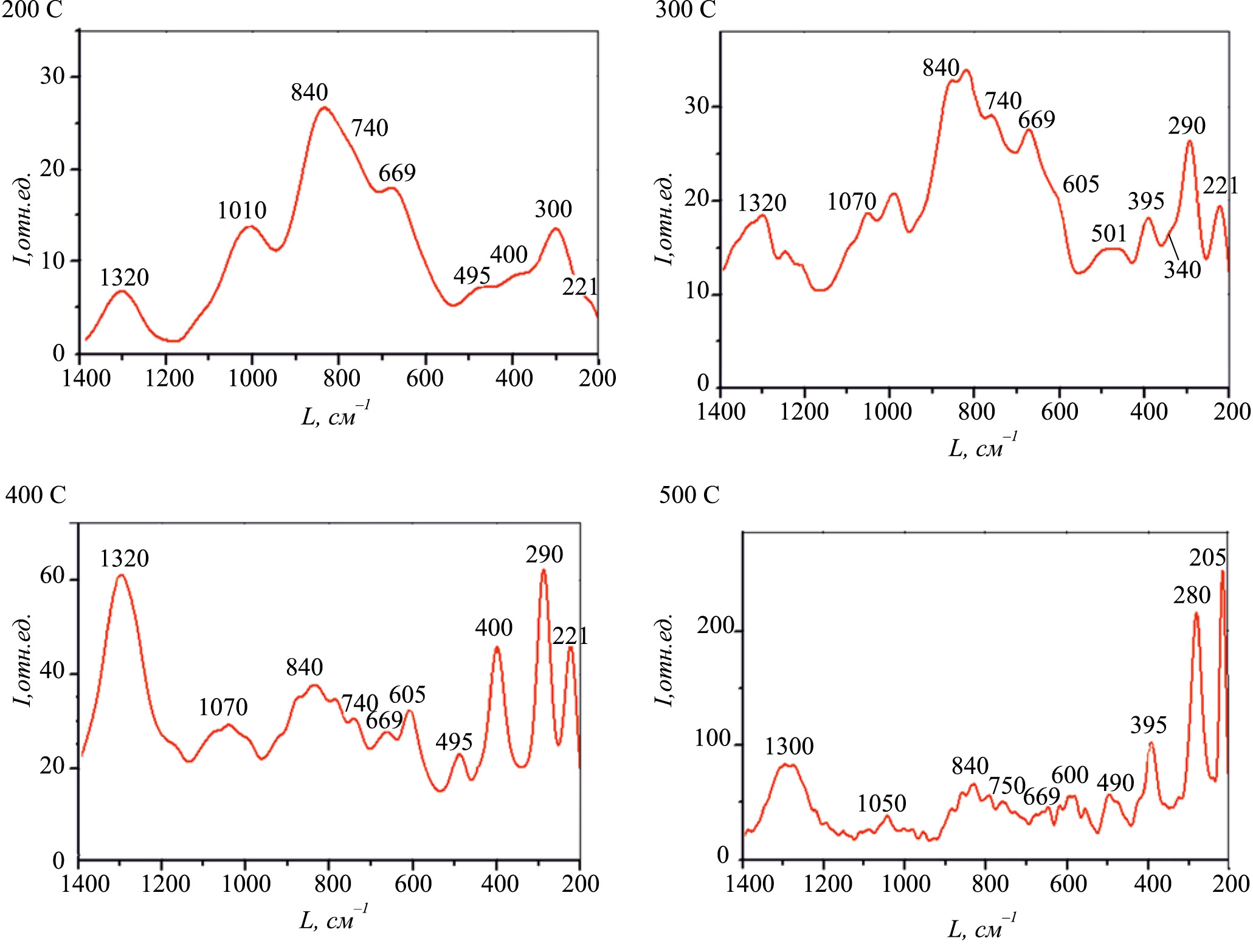 На рис. 3. приведены полученные в настоящей работе оцифрованные, накопленные и сглаженные спектры КР с микроучастка поверхности (100 мкм2) с окисленными частицами железа после термооксидирования при температурах 200°–500°С. Регистрация спектров КР при предельной фокусировке зондирующего излучения на отдельную частицу требовала ограничения интенсивности возбуждающего лазера (для предотвращения лазерно-термические эффектов). Это приводило к существенному росту шумовой компоненты регистрируемых спектров КР. Поэтому для обработки полученных спектров использовалось ограничение шума путем накопления сигнала и результирующего усреднения регистрируемых спектров по времени регистрации. Поскольку процесс окисления при этом не прекращался, оптимальное усреднение достигалось с результирующим уширенем полос КР.