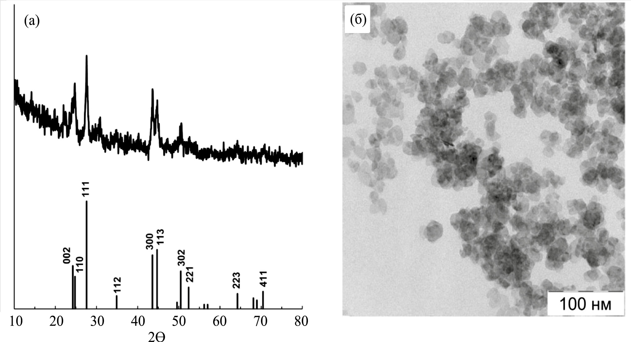 Рис. 2. Рентгеновская дифрактограмма синтезированного LaF3 (a) и его изображение, полученное методом просвечивающей электронной микроскопии (б).