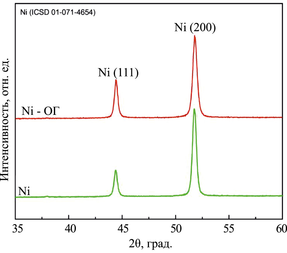 Анализ полученных покрытий методом РФА показал изменение в кристаллической структуре никеля под воздействием углеродного материала (рис. 3). Пики на дифрактограмме при 44.5° и 52.2° отвечают за кристаллические плоскости никеля (111) и (200) соответственно [8]. Как видно из дифрактограммы, преимущественной кристаллической ориентацией для никеля является направление (200), однако в присутствии ОГ происходит увеличение интенсивности пика при 44.5°, что указывает на рост кристалла никеля также в сторону плоскости (111). Очевидно, дисперсная фаза влияет на кристаллическую структуру никелевой матрицы. Слои оксида графена могут служить вакантными местами для роста зародышей металлического осадка, ограничивая рост зерен и делая их более компактными. Стоит отметить, что дифракционный пик, характерный для ОГ, не наблюдается на дифрактограмме вследствие ограниченной способности прибора фиксировать данное соединение при малых концентрациях.