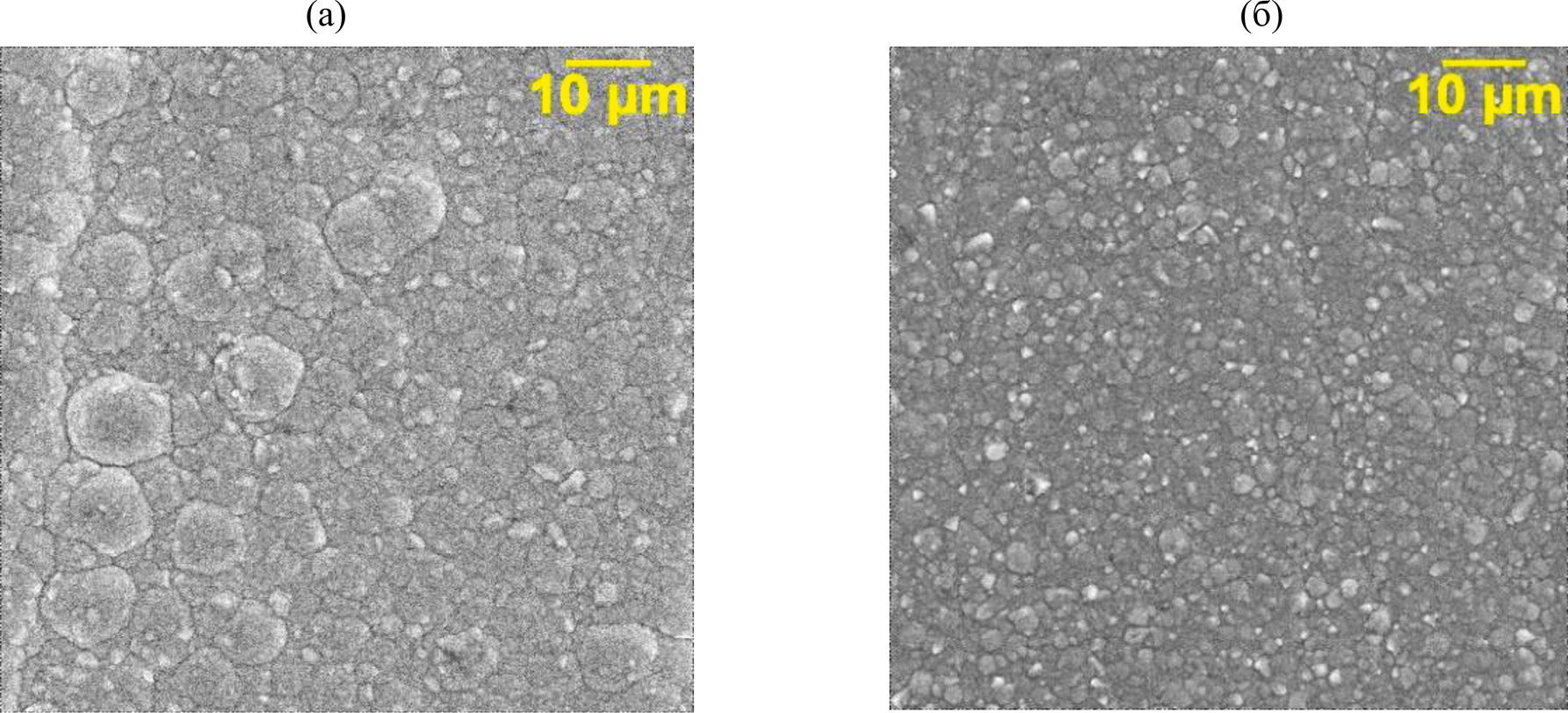 Исследование морфологии поверхности полученных покрытий показало, что дисперсная фаза оказывает влияние на строение осадков. Чистое никелевое покрытие (рис. 4а) характеризуется разупорядоченной, крупнозернистой структурой, близкой к рентгеноаморфной. В то же время, в присутствии ОГ никелевый осадок становится упорядоченным, равномерным и мелкозернистым (рис. 4б). Очевидно, частицы оксида графена выступают в качестве центров кристаллизации и способствуют распределению металлического никеля по катодной поверхности.