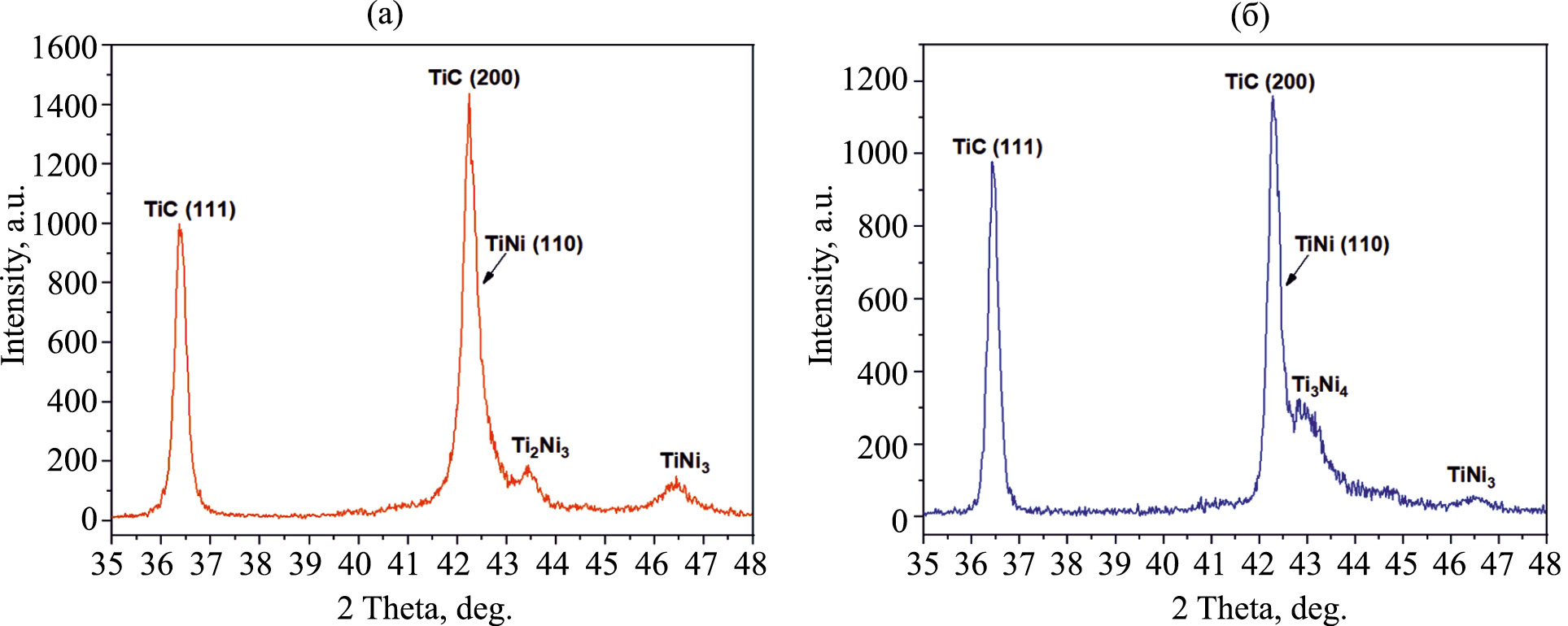 Рассчитанное значение параметра решетки aTiC в результате модификации уменьшается с 4,287 Å до 4,281 Å, что может говорить о снижении концентрации углерода в зернах TiC [10]. Этот результат коррелирует с данными ЭДА- анализа (уменьшение содержания углерода в зернах TiC) и РЭМ-изображений (плавление TiC при воздействии МИП, приводящее к разрушению Ti-C связей и диффузии свободного углерода в TiNi).