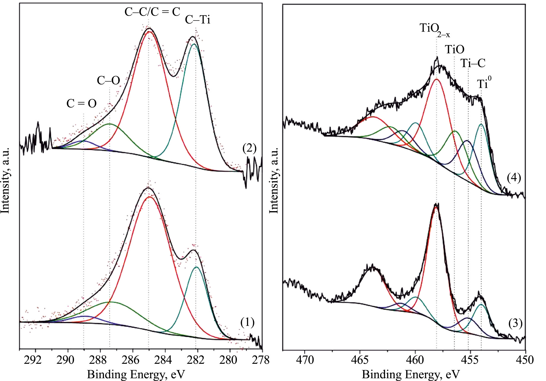 Изменение химического состояния поверхностных слоев образцов после облучения МИП исследовалось методом РФЭС. На рис. 6 представлены РФЭС спектры углерода и титана, измеренные на исходном и однократно облученном образцах после проведения ионной очистки для удаления атмосферных загрязнений. В C_1s спектре исходного образца (рис. 6, кривая 1) углерод присутствует в нескольких химически неэквивалентных состояниях. Наиболее интенсивный компонент на энергии связи ~285 эВ отвечает свободному углероду в С=С/C–C связях [11]. Компонент на энергии связи ~282 эВ отвечает углероду, химически связанному с титаном в составе карбидных зерен [12]. Компоненты, расположенные на высоких энергиях связи (287.5 и 289 эВ), отвечают углероду в составе С–O и С=O связей [13]. В РФЭС С 1s спектре образца после однократного воздействия МИП (рис. 6, кривая 2) наблюдается перераспределение интенсивности компонентов: отмечается заметное увеличение относительной интенсивности компонента, отвечающего углероду в составе Ti-C связей.