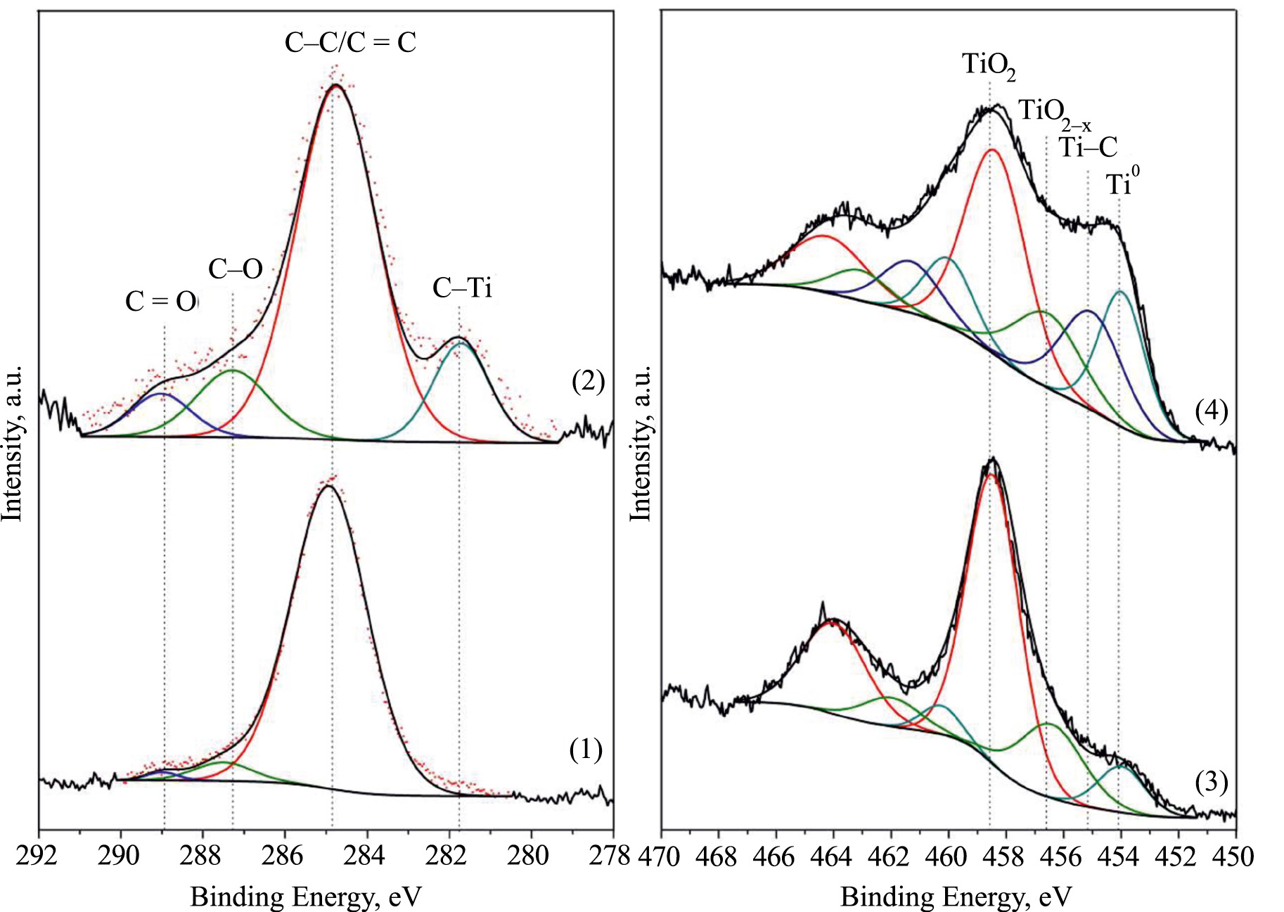 В РФЭС Ti 2p спектре исходного образца наблюдаются дублетные компоненты, отвечающие оксиду титана TiO2, металлическому титану, а также нестехиометрическому оксиду титана, который расположен в промежуточном слое между поверхностным оксидом и металлическим титаном. В Ti 2p спектре после облучения МИП наблюдается заметное снижение интенсивности компонента TiO2 и увеличение интенсивности спектра со стороны низких энергий связи. Результат разложения (с учетом данных РФЭС анализа спектра углерода) показал, что кроме компонентов, отвечающих нестехиометрическому оксиду и металлическому титану в спектре присутствует компонент на энергии связи 455.1 отвечающий титану в составе карбида.