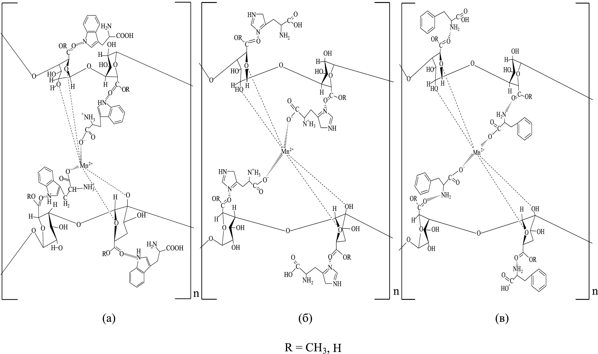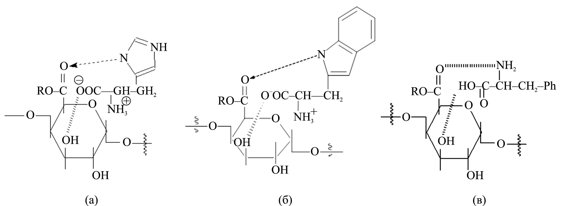 Рис. 1. Структуры перспективных звеньев модифицированных пектинов: ПК-His (А), ПК-Trp (Б), ПК-Phe (В).