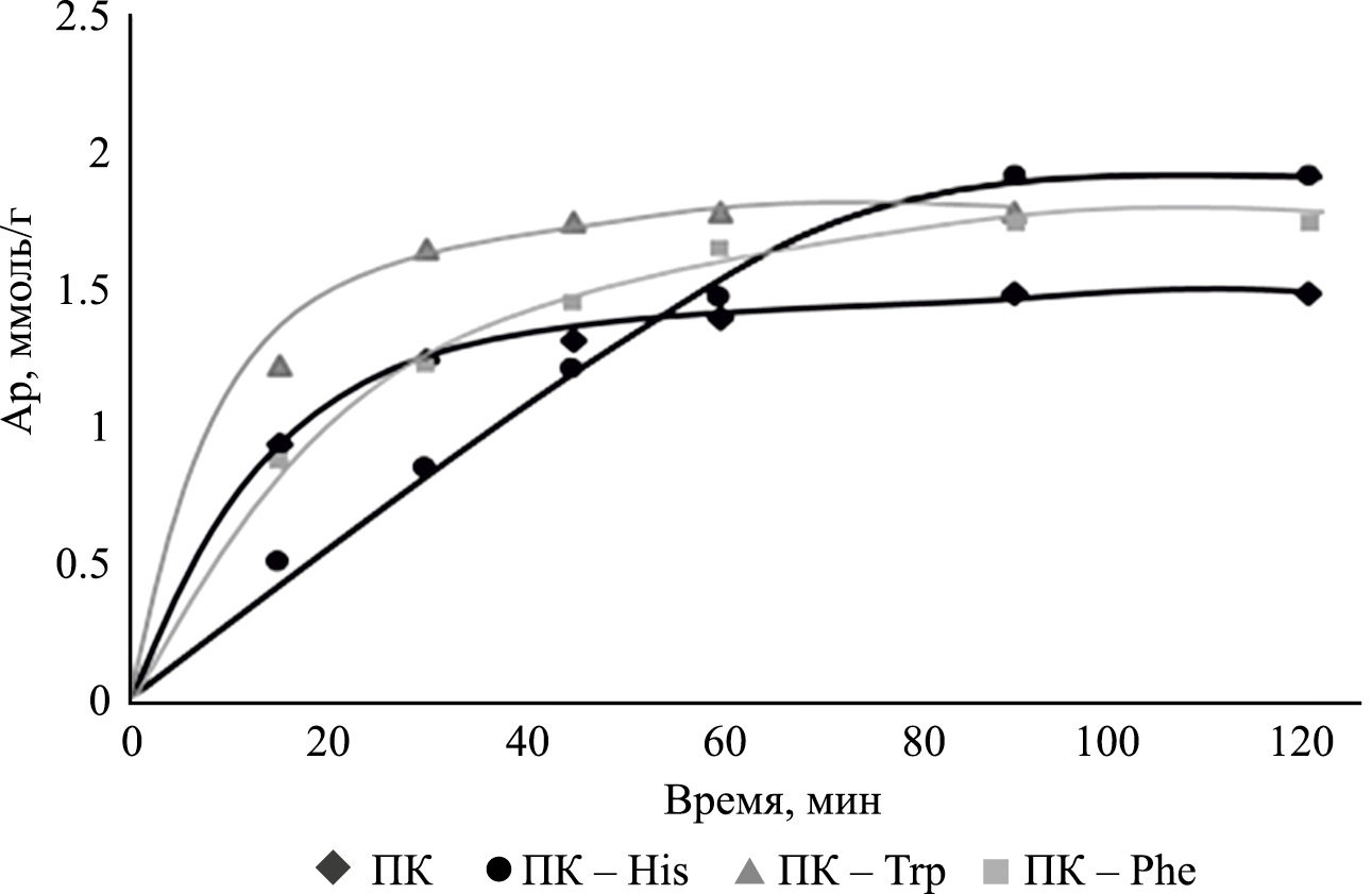 На рис. 3 приведены интегральные кинетические кривые сорбции ионов Mn2+ модифицированными пектинами. Установлено, что природа сорбента оказывает существенное влияние как на время установления сорбционного равновесия, так и на эффективность сорбции. Быстрее всего (60 мин) сорбционное равновесие устанавливается на системе ПК-Trp, а степень извлечения ионов Mn2+ увеличивается в ряду: ПК–His > ПК–Tr p> ПК–Phe, который коррелирует со значениями удельной площади поверхности, размерами частиц и константами устойчивости (βк) МП (табл. 1). При этом величины сорбционной емкости модифицированных пектинов в зависимости от природы аминокислоты составляют 1.74–1.92 ммоль/г, что соответствует степени извлечения 87.0–95.8%. Полученные результаты свидетельствуют о сохранении хороших равновесно-кинетических свойств модифицированных биосорбентов.