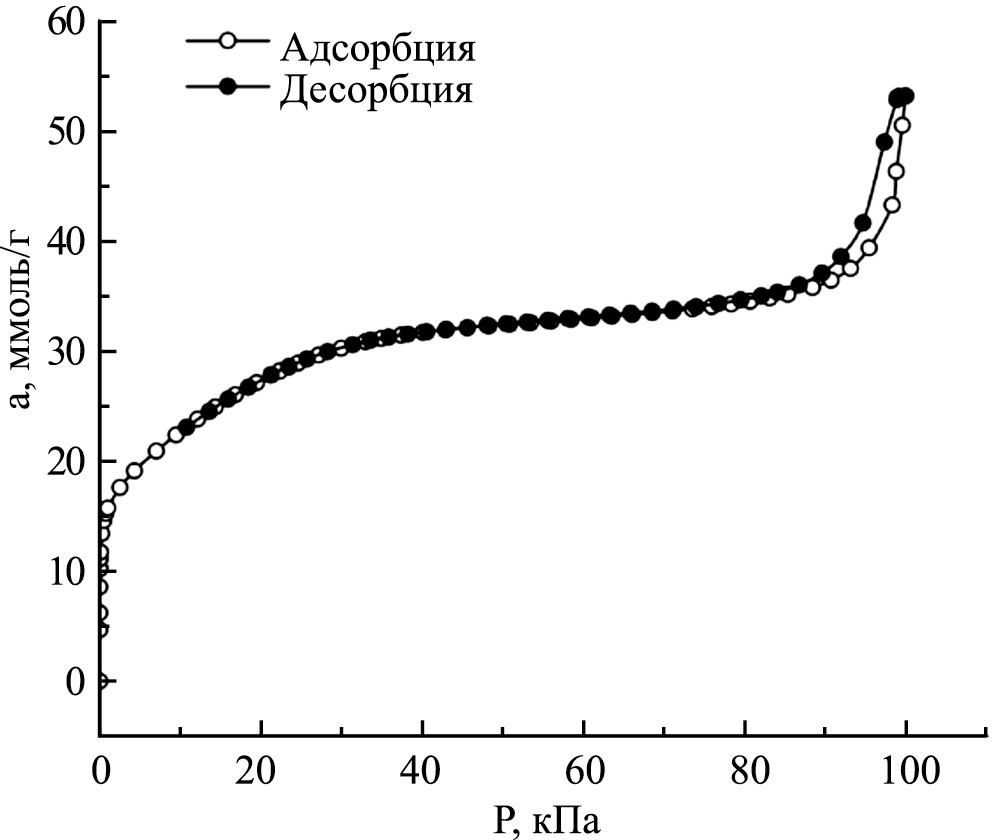 Рис. 1. Изотерма адсорбции азота (N2) на адсорбенте ФАС-097 при температуре 77 К. Светлые значки – адсорбция; зачерненные – десорбция.