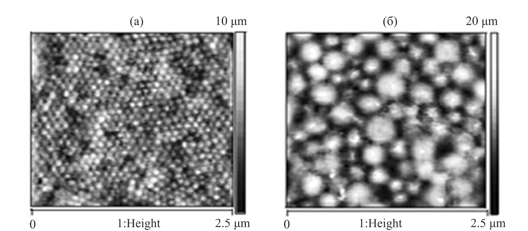 Рис. 1. Структура поверхности свободных пленок немодифицированных латексных полимеров: (а) А; (б) М [25].