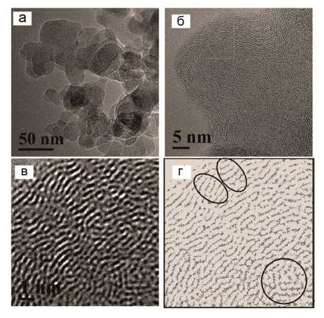 Рис. 11. a-г. Электронно-микроскопические изображения (а-в) и фрагмент структуры графеновых слоев, представленных в виде скелетонизированного изображения (г) образца N375-0-1500