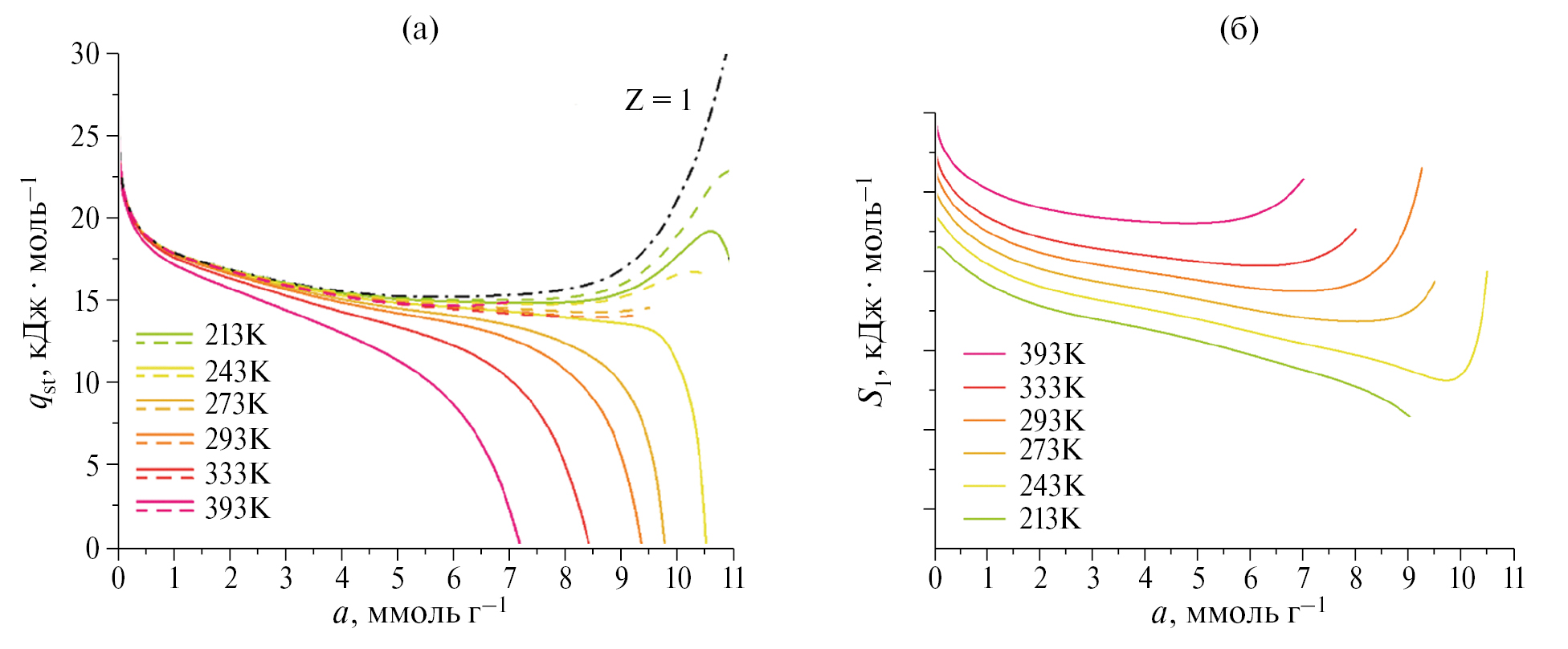 Для того чтобы учесть все факторы, влияющие на дифференциальную изостерическую мольную теплоту адсорбции метана на PAC-3, qst [кДж ⋅ моль–1], такие как неидеальность газовой фазы, крутизна изотерм (∂P/∂a)T и изостер (∂lnP/∂(1/T))a адсорбции, а также деформации, вызванные как температурой, так и адсорбцией: (∂Va/∂T)a и (∂Va/∂a)T, соответственно, мы использовали формулу Бакаева [53]:
