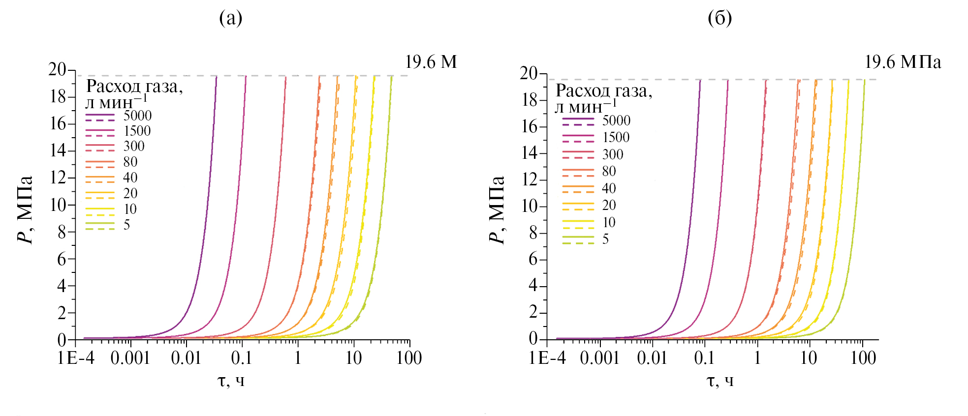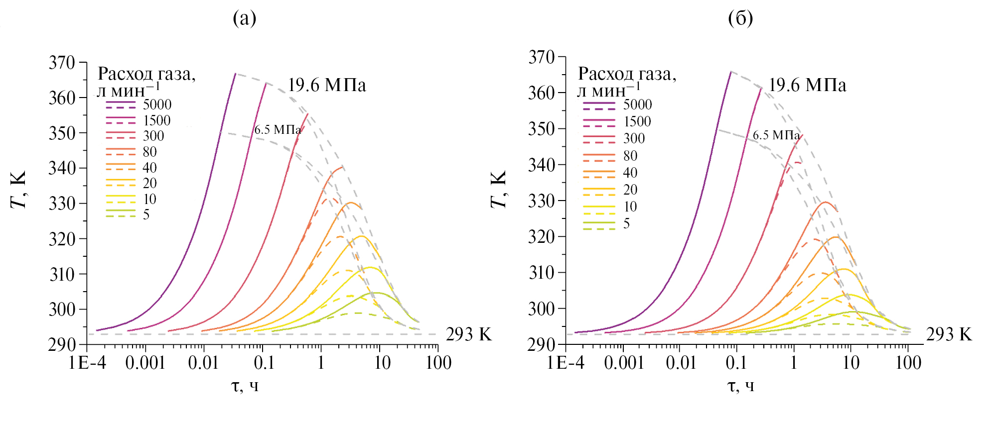 Представленная система уравнений (11)-(13) решалась с использованием последовательных приближений на каждом временном шаге, размер которого определялся пропорционально скорости протекающих процессов (удельный расход газа при заправке и выдаче, перепад температур при стабилизации параметров P и T), а также с учетом коэффициента теплообмена с внешней средой для обеспечения пренебрежимо малой математической погрешности в процессе вычислений.