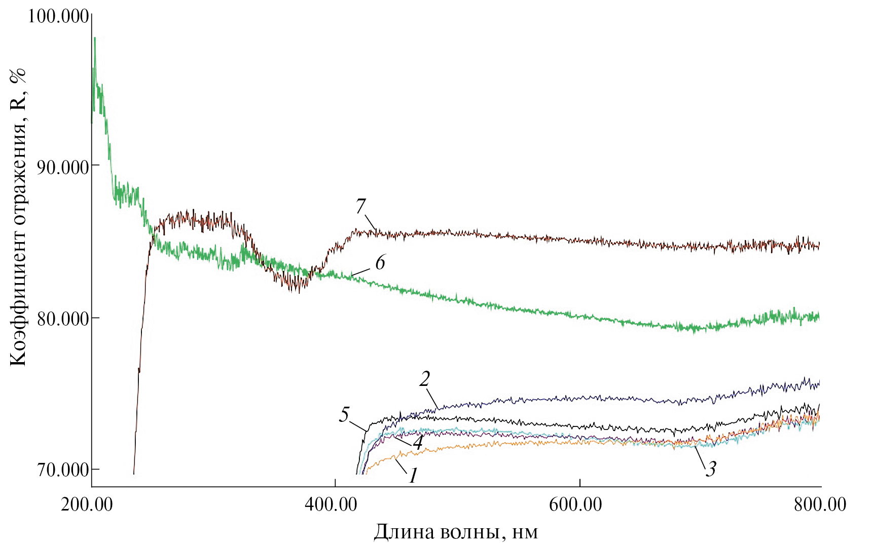 1 – KRONOS-2190, 2 – Р-02, 3 – TIKON TR-33, 4 – ТИОКСИД ® TR90, 5 – TIOXIDE R-TC30, 6 – BaSO4 в кювете, 7 – MgO ч (реактив 1).