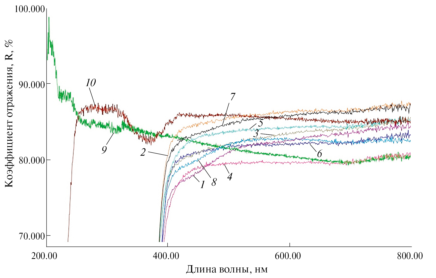 Рис. 2. Оптические спектры отражения образцов диоксида титана, полученных из ильменитового концентрата Ариадненского месторождения (нумерация образцов в соответствии с табл. 5): 1 – образец 6, 2 – образец 7, 3 – образец 8, 4 – образец 11, 5 – образец 9, 6 – образец 10, 7 – образец 12, 8 – образец 13, 9 – BaSO4 в кювете,