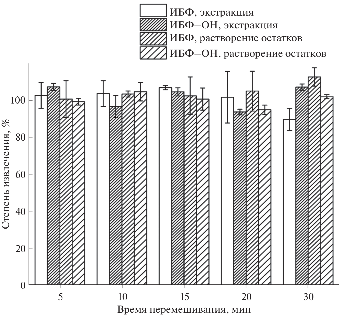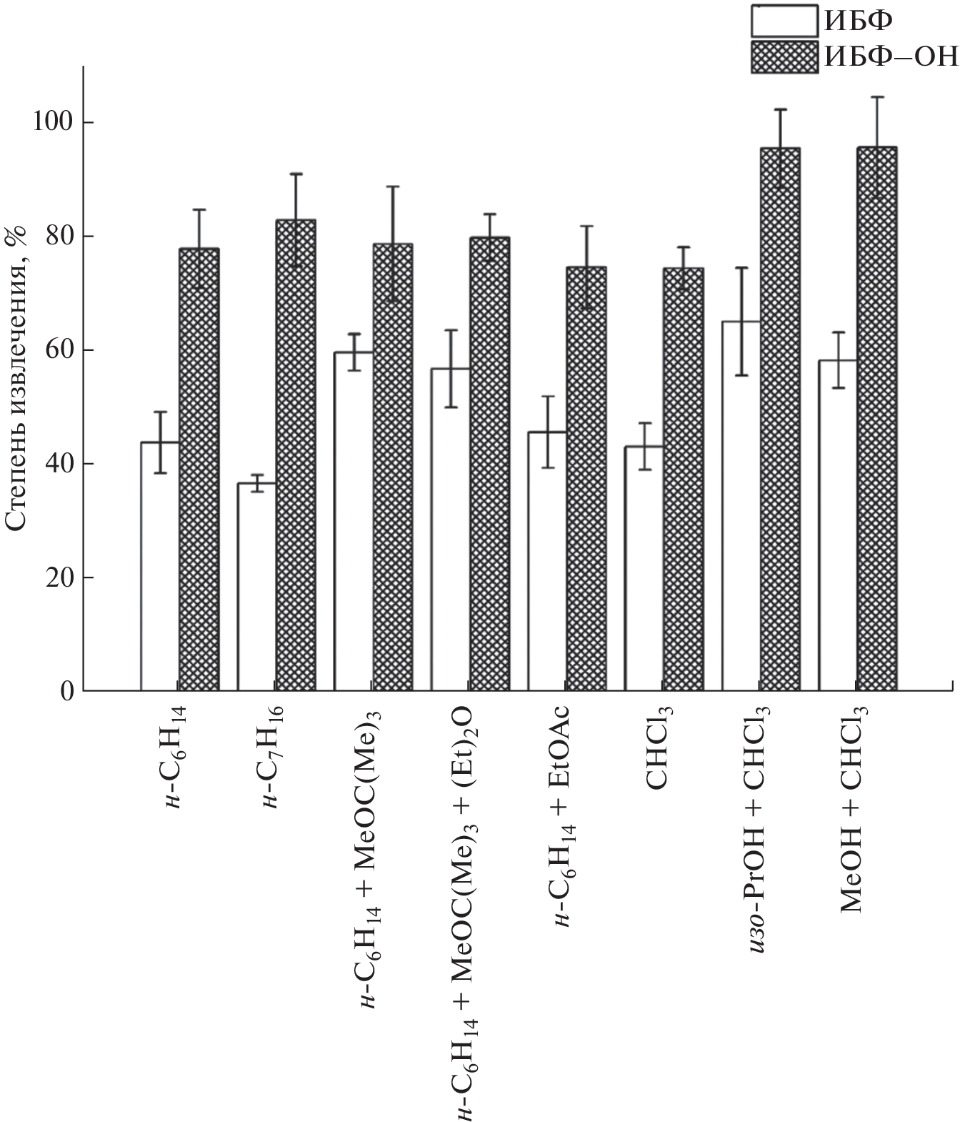 A procedure is proposed for the extraction of 2,6-diisobornyl-4-methylphenol (IBP), the molecule with potential multi-target activity, and its active metabolite 2,6-diisobornyl-4-hydroxymethylphenol (IBP–OH) from human and rat plasma samples for further determination by liquid chromatography–tandem mass spectrometry. The solubility of IBP (in mg/mL) in various organic solvents is determined. In particular, the compound is readily soluble in chloroform (346 ± 14), methyl tert-butyl ether (98.6 ± 3.8), and ethyl acetate (96.8 ± 2.0). It is shown that the use of a mixture of chloroform and isopropanol (5 : 1, v/v) as an extraction system with simultaneous protein precipitation makes it possible to extract only 66 ± 10% of IBP, while the recovery of IBP–OH is 96 ± 7%. Pre-dilution of 200 µL of plasma with 300 µL saline increases IBP recovery to 100 ± 4%. Drying the extracts in a vacuum concentrator (air, 45°C) with the further reconstitution of the residues in 300 μL of acetonitrile facilitates the purification of biosamples and the preconcentration of analytes. The total sample preparation time does not exceed 70 min, and the duration of an analysis is 7 min, the injection volume is 2 µL. The procedure has been successfully tested on actual rat plasma samples after a single oral administration of IBP (10 mg/kg in oil) in the framework of pharmacokinetic studies.