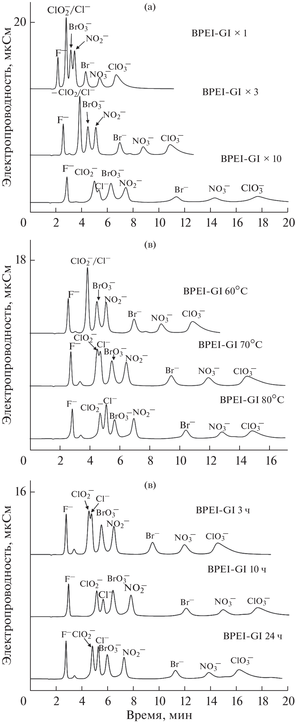 С целью расширения области применения анионообменников на основе сополимера стирола и дивинилбензола с привитым полиэтиленимином, кватернизованным глицидолом, осуществлено варьирование условий их синтеза: количества добавленного глицидола, температуры и продолжительности синтеза. Исследовано влияние данных факторов на емкость, селективность и эффективность сорбентов в режиме ионной хроматографии с подавлением, кроме того, неподвижные фазы изучены в режиме гидрофильной хроматографии с помощью теста Танака. Показано, что исследуемые условия синтеза позволяют управлять емкостью и селективностью анионообменников, при этом их гидрофильность меняется незначительно. Впервые изучено поведение оксоанионов на ковалентно привитых сорбентах в режиме ионной хроматографии, а также продемонстрирована применимость фаз с кватернизованным полиэтиленимином в режиме гидрофильной хроматографии для разделения сахаров, аминокислот, водорастворимых витаминов, нуклеозидов и азотистых оснований.