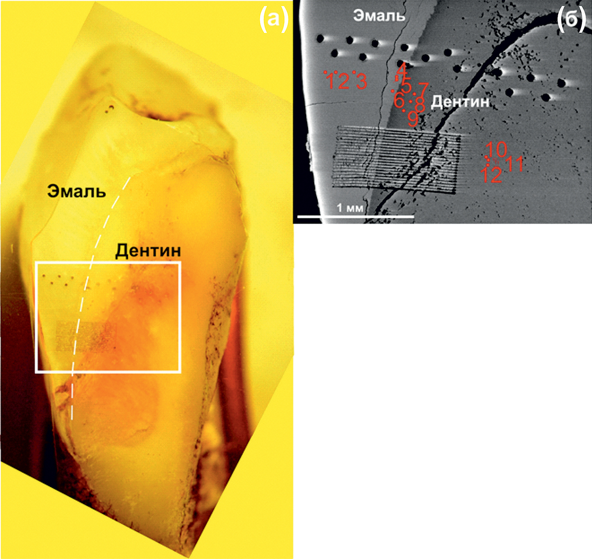 Материалы и методики исследований. Фрагмент распиленного в продольном направлении зуба, примерно соответствующий его четверти, смонтировали в кольце диаметром около 20 мм и залили эпоксидной смолой (рис. 1а).