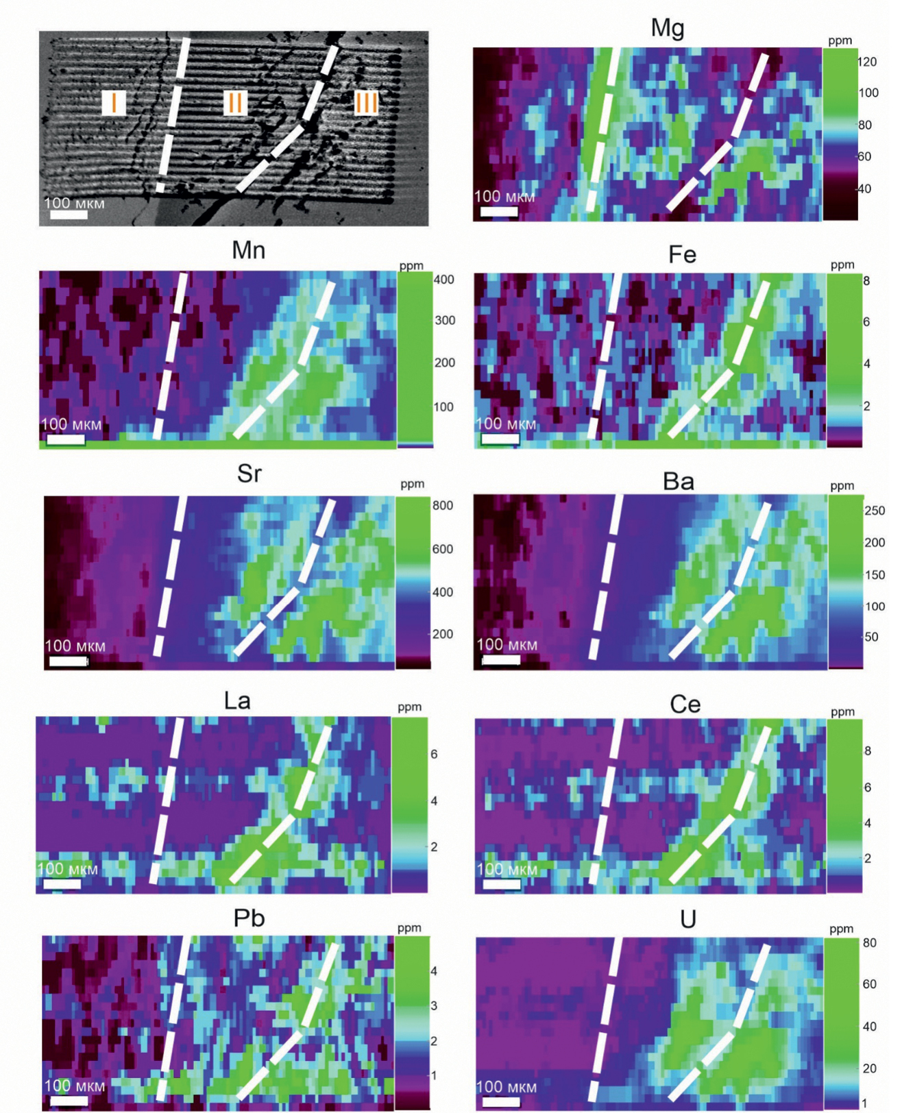 Рис. 2. Микроэлементное картирование участка зуба TAX 705 методом масс-спектрометрии с индуктивно связанной плазмой и лазерной абляцией. I – эмаль, II – граничная зона эмаль–дентин, III – дентин