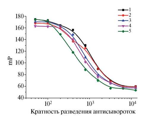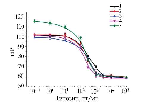 Изучение взаимодействия конъюгата тилозин–флуоресцеин с антисыворотками. Взаимодействие синтезированного конъюгата ТИЛ-ФЛУ со специфическими антителами в антисыворотках регистрировали по изменению поляризации флуоресценции. При этом использовали разведения препаратов антисывороток от 100 до 1 200 (данные не приведены), критерием выбора разведения было значение поляризации флуоресценции на уровне 120 mP. Разбавленные антисыворотки смешивали с раствором конъюгата ТИЛ-ФЛУ и через 10 мин измеряли поляризацию флуоресценции. Данная величина возрастала, что свидетельствовало о связывании антител с конъюгатом ТИЛ-ФЛУ. В качестве отрицательного контроля использовали неиммунную сыворотку кролика, смешивание конъюгата ТИЛ-ФЛУ с которой показало низкие значения поляризации флуоресценции – 53±2 mP. Для сывороток, содержащих антитела к тилозину, наблюдалось изменение поляризации флуоресценции в зависимости от их разведения (рис. 1). Для дальнейшего осуществления конкуренции между меченым тилозином (ТИЛ-ФЛУ) и свободным тилозином за центры связывания антител использовали разведения антисывороток, обеспечивающие 50%-ное ингибирование сигнала (параметр IC50). Данные величины составили: 1: 1 050 для антисыворотки № 1, 1:1 070 для антисыворотки № 2, 1:750 для антисыворотки № 3, 1:700 для антисыворотки № 4 и 1:400 для антисыворотки № 5. Как видно, наибольшими разведениями характеризовались препараты № 2 и № 1.
