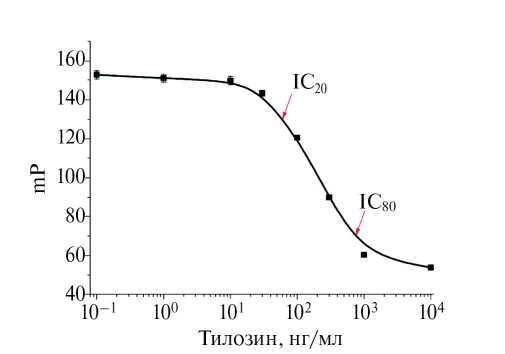 Определение аналитических характеристик поляризационного флуоресцентного иммуноанализа. Зависимость поляризации флуоресценции от концентрации тилозина (градуировочную кривую) строили в полулогарифмических координатах и аппроксимировали с помощью четырехпараметрической сигмоидной функции. Значения IC10, IC20, IC50, IC80 рассчитывали как концентрации, снижающие аналитический сигнал на 10, 20, 50 и 80% соответственно. Значение IC10 оценивали как предел обнаружения, IC20–IC80 – рабочий диапазон определяемых концентраций. Значения кросс-реактивности рассчитывали по формуле: CR(%) = IC50(ТИЛ)/IC50(аналог) × 100%.