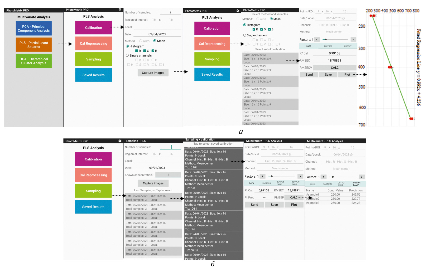Рис. 8. Использование алгоритма PLS (а) и определение концентрации с его помощью (б) в PhotoMetrix PRO.