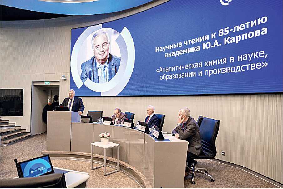 С приветствием к участникам чтений обратился проректор НИТУ МИСиС д. т. н., проф. М.Р. Филонов, который отметил, что для университета МИСиС деятельность Ю.А. Карпова и созданной им выпускающей кафедры сертификации и аналитического контроля имела и имеет большое значение. Академик Ю.А. Золотов отразил основные вехи биографии Ю.А. Карпова, рассказал о многих десятилетиях активного взаимодействия с ним в Российской академии наук. Особо была подчеркнута роль Ю.А. Карпова в развитии прикладной, производственной аналитики, кратко отмечены основные направления его научной деятельности: определение газов в металлах, аналитический контроль в цветной металлургии, анализ высокочистых веществ, развитие методов анализа редких и благородных металлов, обеспечение качества химического анализа, включая метрологию. Академик К.В. Григорович поделился подробностями начала научной деятельности Ю.А. Карпова в Институте металлургии им. А.А. Байкова АН СССР, остановился на его выдающейся роли в развитии методов определения газообразующих примесей в металлах и рассмотрел сегодняшнее состояние этого направления, включая фракционный анализ, позволяющий определять форму нахождения аналитов.