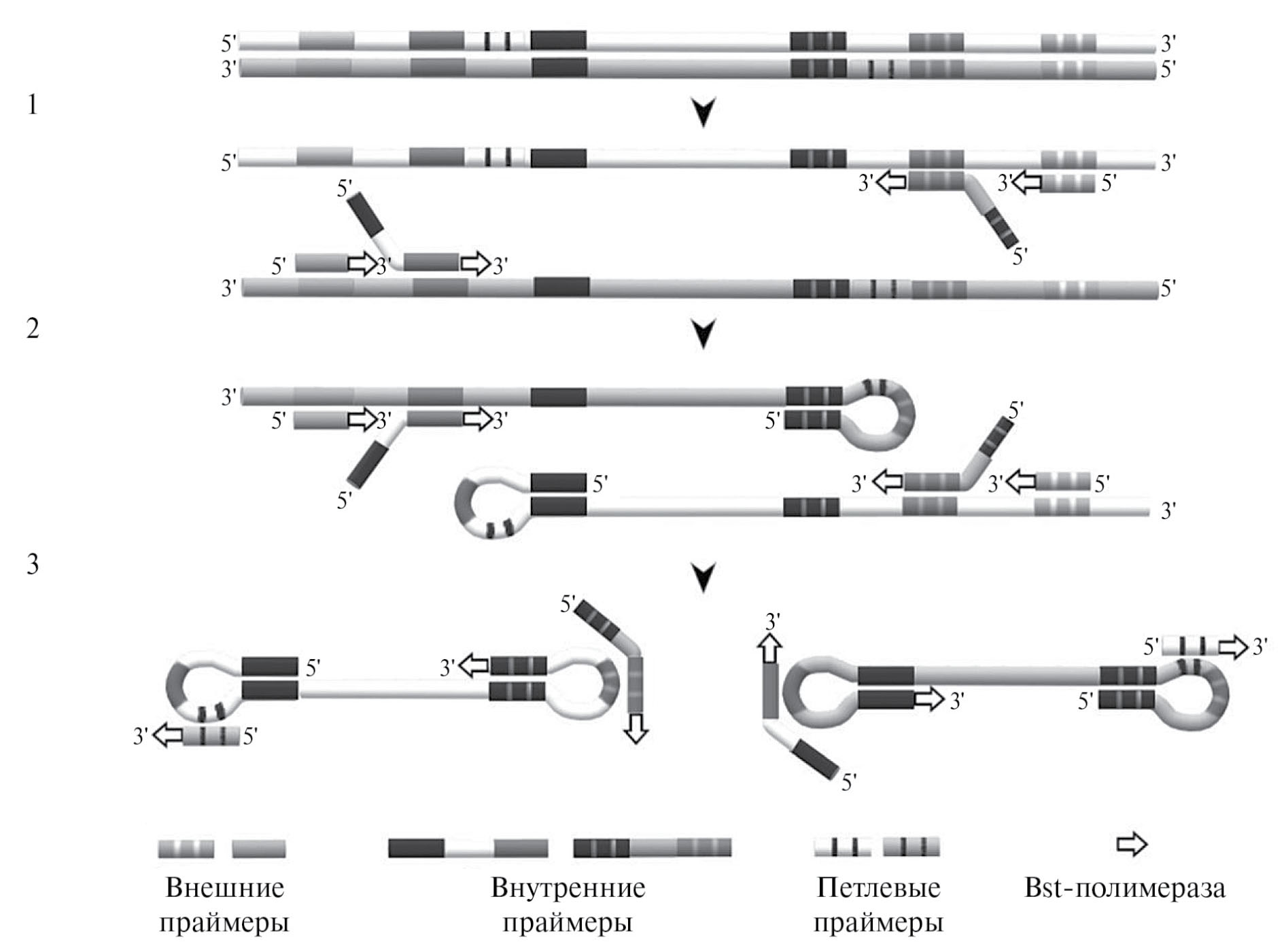 Петлевая изотермическая амплификация. Метод LAMP разработан в 2000 году Нотоми с соавт. [27]. В данном методе используют только один фермент — Bst-полимеразу с цепь-вытесняющей активностью, но, в отличие от RPA, не одну, а две пары праймеров, первая из которых обозначается как “внешние” (англ. outer primers), а вторая — “внутренние”(англ. inner primers) [27, 28]. Внутренние праймеры сконструированы определённым образом: с 5'-конца они имеют участок, комплементарный участку ДНК-мишени, а с 3'-конца — участок, чья последовательность идентична последовательности участка ДНК-мишени (рис. 2, шаг 1). Такая конструкция внутренних праймеров в сочетании с внешними и способностью Bst-полимеразы отодвигать цепь ДНК при синтезе новой цепи по ДНК-матрице приводит к формированию гантелеподобных ДНК-структур (рис. 2, шаг 2), которые далее экспоненциально амплифицируются с участием внутренних праймеров и Bst-полимеразы (рис. 2, шаг 3). LAMP проводят при постоянной температуре в интервале 60—65 оC, однако для начала амплификации, в отличие от RPA, необходимо предварительно денатурировать ДНК-матрицу (что достигается прогреванием реакционной смеси при 95 оC в течение 5 мин) для последующего связывания внутренних и внешних праймеров с комплементарными им участками цепей дцДНК при понижении температуры до 60—65 оC [27, 28]. Для обнаружения микроорганизмов по специфическим транскриптам или РНК-вирусов обратная транскрипция должна быть выполнена либо отдельно от LAMP, либо в формате “одной пробирки” непосредственно перед амплификацией (до прогревания LAMP-пробы при 95 оC) внесением в реакционную смесь обратной транскриптазы (англ. reverse transcription LAMP, RT-LAMP) [28]. Поскольку для проведения LAMP могут использоваться такие рекомбинантные полимеразы, как Bst-3.0 и OmniAmp, которые обладают ревертазной активностью, детекция РНК-мишени возможна и в формате “одной пробирки” без добавления обратной транскриптазы [29, 30]. Как и в случае RPA, смесь реагентов для LAMP может быть лиофилизована и регидрирована перед использованием [31, 32].