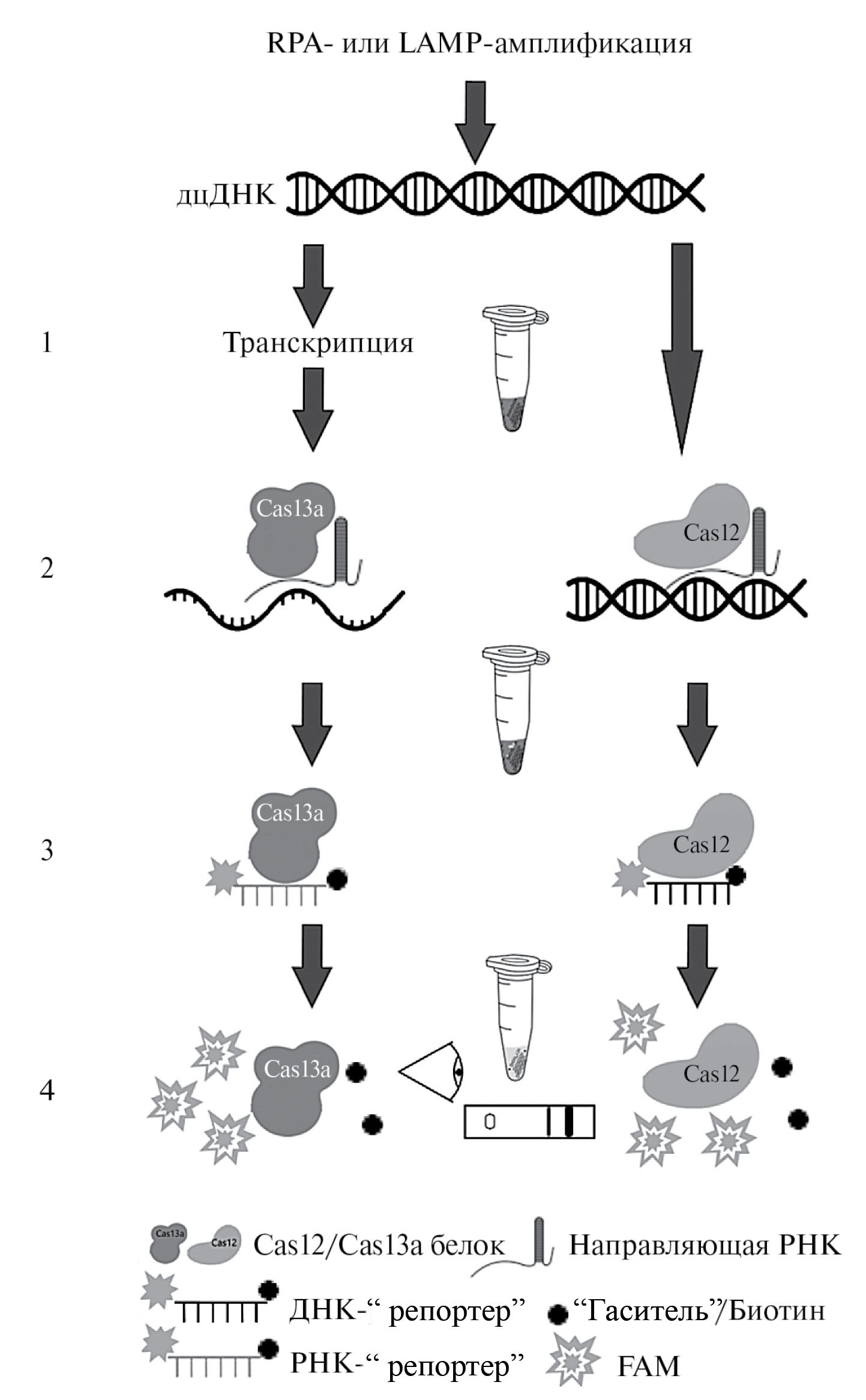 Рис. 3. Схематическое изображение детекции RPA- и LAMP-ампликонов с использованием CRISPR/Cas-нуклеаз Cas13а и Cas12 (Cas12а или Cas12b).