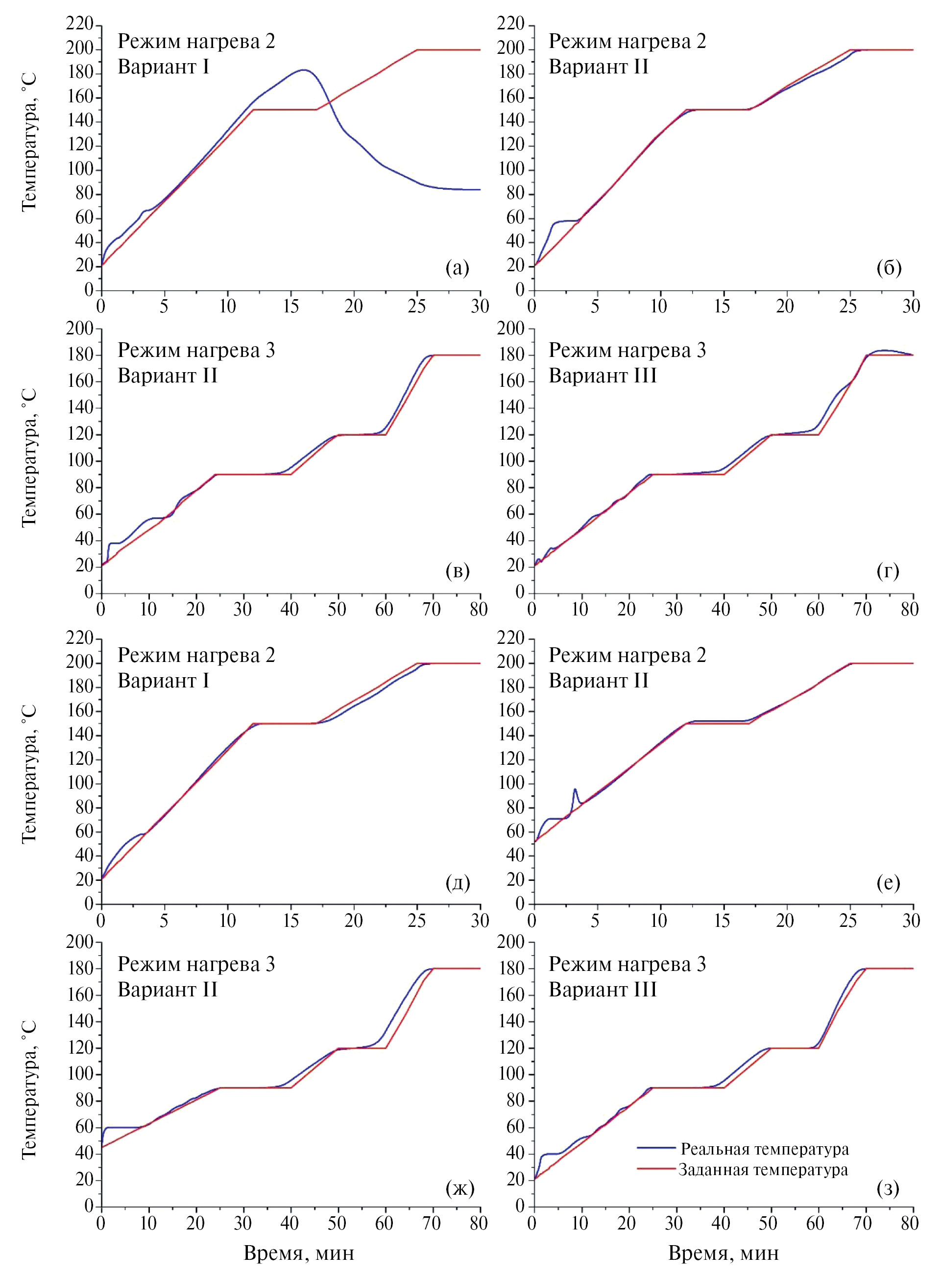Ход нагрева и достижение заданных температур при двух- и трехступенчатом режиме работы СМВР показаны на примере получения растворов ССО ЭК-1 и ССО ХСС-1 из навесок 0.1 г и комбинации кислот 3N-0.5OH-0.05F (рис. 1). При двухступенчатом режиме работы СМВР (скорость нагрева на первой ступени 10.75 °C/мин) и варианте I добавления реагентов для навески ССО ЭК-1 (содержание кремния 1.1 мас. %) срабатывает аварийное отключение магнетрона, когда реальная температура значительно отличается от заданной (рис. 1а). Аварийное отключение при режиме 2 нагрева сосудов и добавлении реагентов по варианту II не наблюдали. Тем не менее в растворе ЭК-1 наблюдали осадок (табл. 7). Кроме этого, в течение первых трех минут в сосуде происходит резкий рост температуры (синяя линия), значительно отличающийся от заданного (красная линия) (рис. 1б, в). Аналогичный скачок температуры наблюдали при получении раствора ССО ХСС-1 (рис. 1д–з). Таким образом, запрограммированный двухступенчатый режим снижает количество брака при химической пробоподготовке навесок массой 0.1 г (табл. 7), но не исключает вариант неполного перевода больших масс образца в раствор даже при максимальной температуре. Наиболее плавное достижение заданных температур происходит в трехступенчатом режиме (табл. 6), когда скорость нагрева содержимого сосудов на первой ступени составляет 2.76 оC/мин (рис. 1в, г, ж, з).