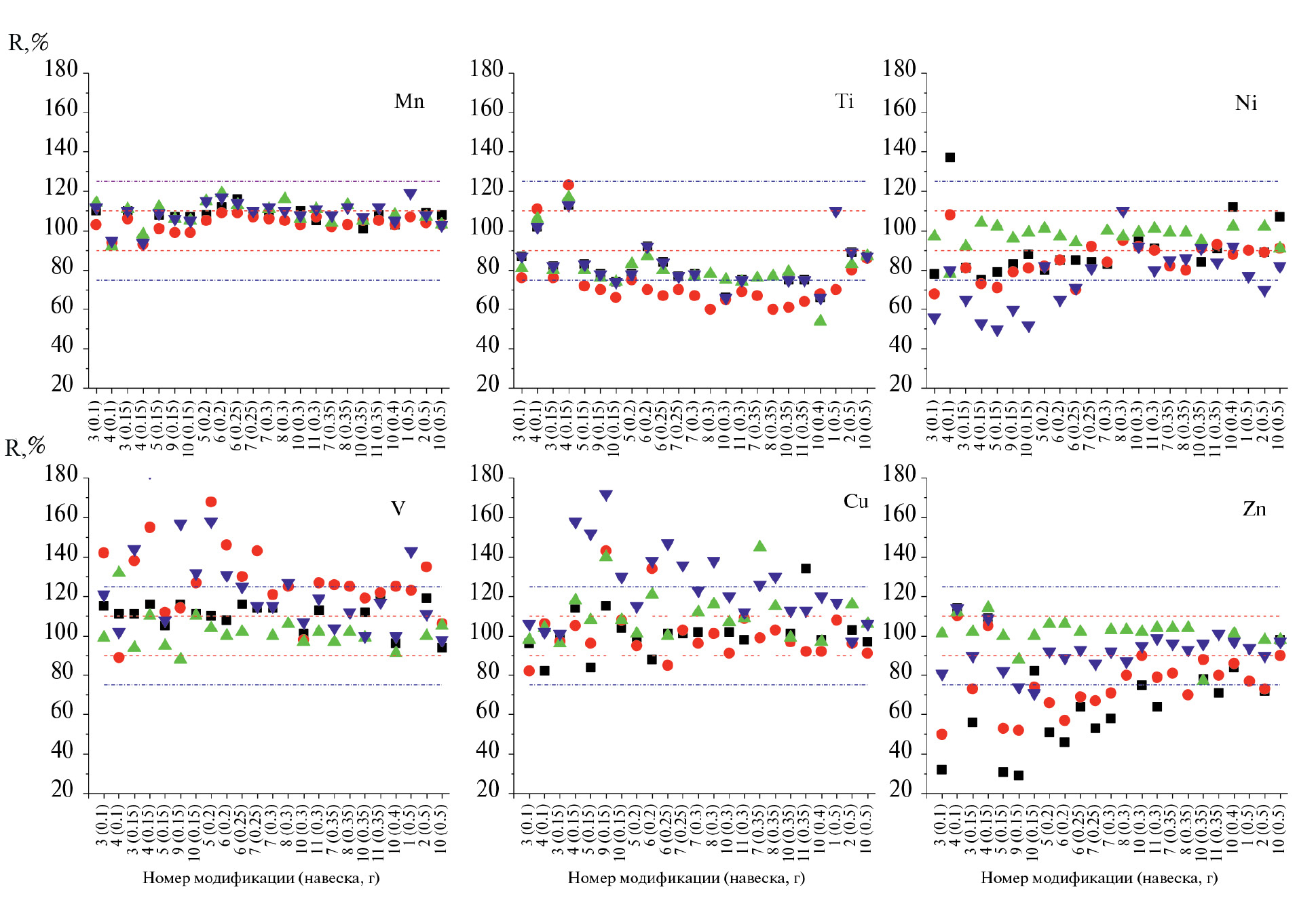 Удовлетворительные и хорошие результаты определения Mg, Ca, Fe, K, Mn, Ba, Sr и P достигнуты для растворов, приготовленных из навесок массой 0.15 г и более, минерализованных обработкой реакционными смесями разных модификаций (рис. 2). Однако для АЭС-ИСП-определения B, Rb, Ni, Cu, V, Zn с содержаниями менее 15, 5, 3, 5, 1 и 25 мг/кг соответственно требуется приготовление растворов из аналитических навесок более 0.35 г (рис. 2 и табл. 8).