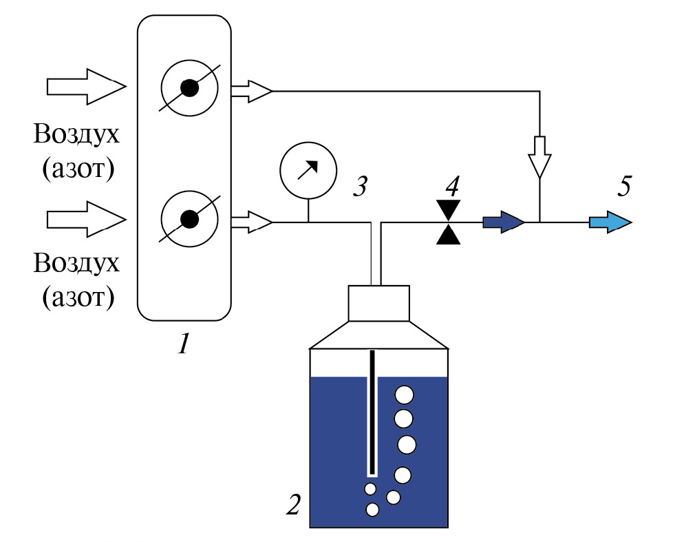 Рис. 1. Схема генерирования стандартных газовых смесей с разбавлением. 1 – двухканальный формирователь газовых потоков с двумя регуляторами расхода газа; 2 – сосуд с водным раствором аналита; 3 – деформационный манометр; 4 – регулируемый механический дроссель; 5 – выход стандартной газовой смеси с аналитом.