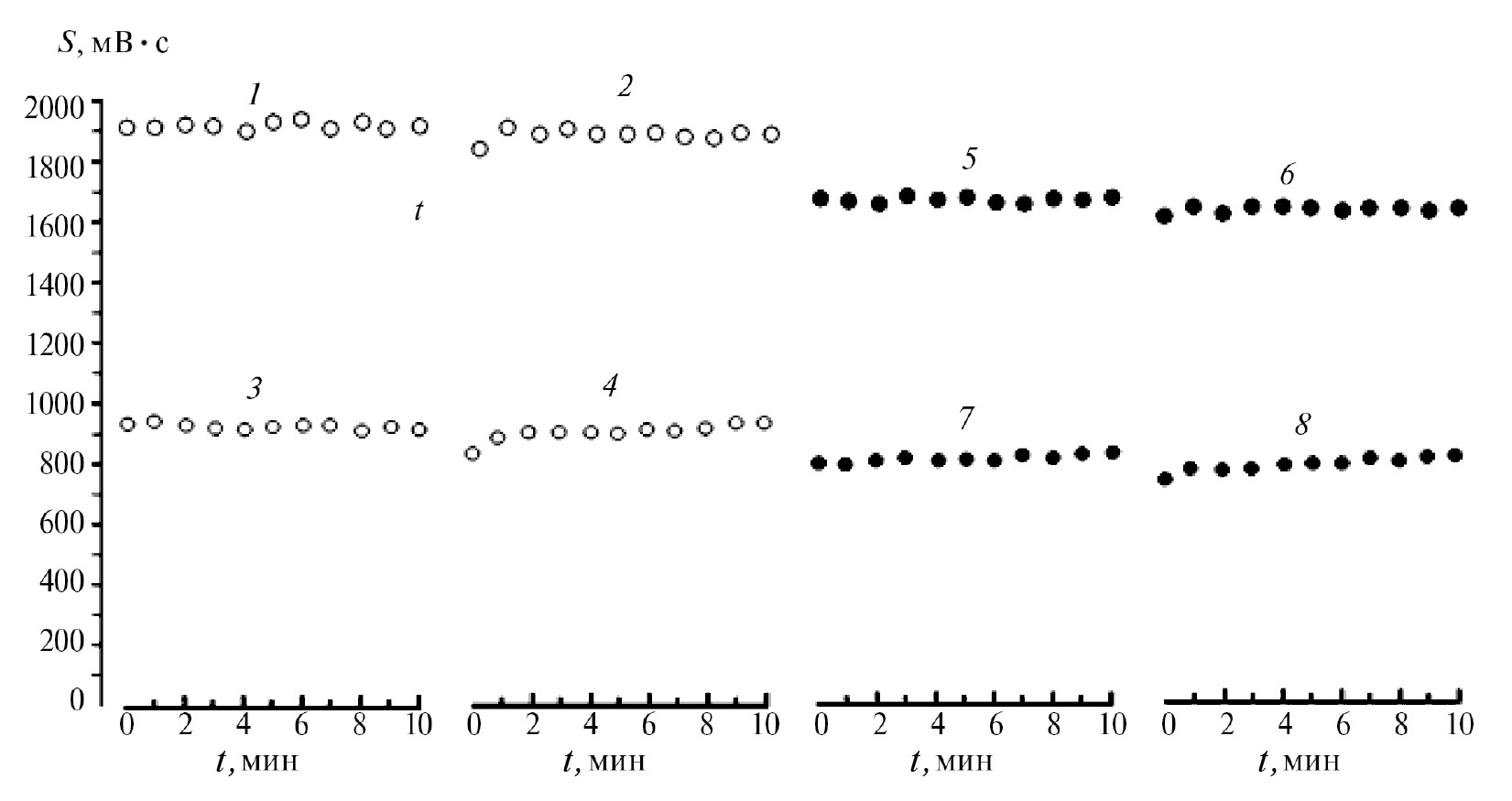Рис. 3. Динамика изменения концентрации (площади пика на хроматограмме) фенола (1–4) и бутанола (5–8) в потоке газовой фазы на выходе из сорбционной колонки при насыщении (1, 3, 5, 7) и десорбции (2, 4, 6, 8). Концентрация аналитов в газовой фазе 20 мг/м3 (1, 2, 5, 6) и 10 мг/м3 (3, 4, 7, 8).