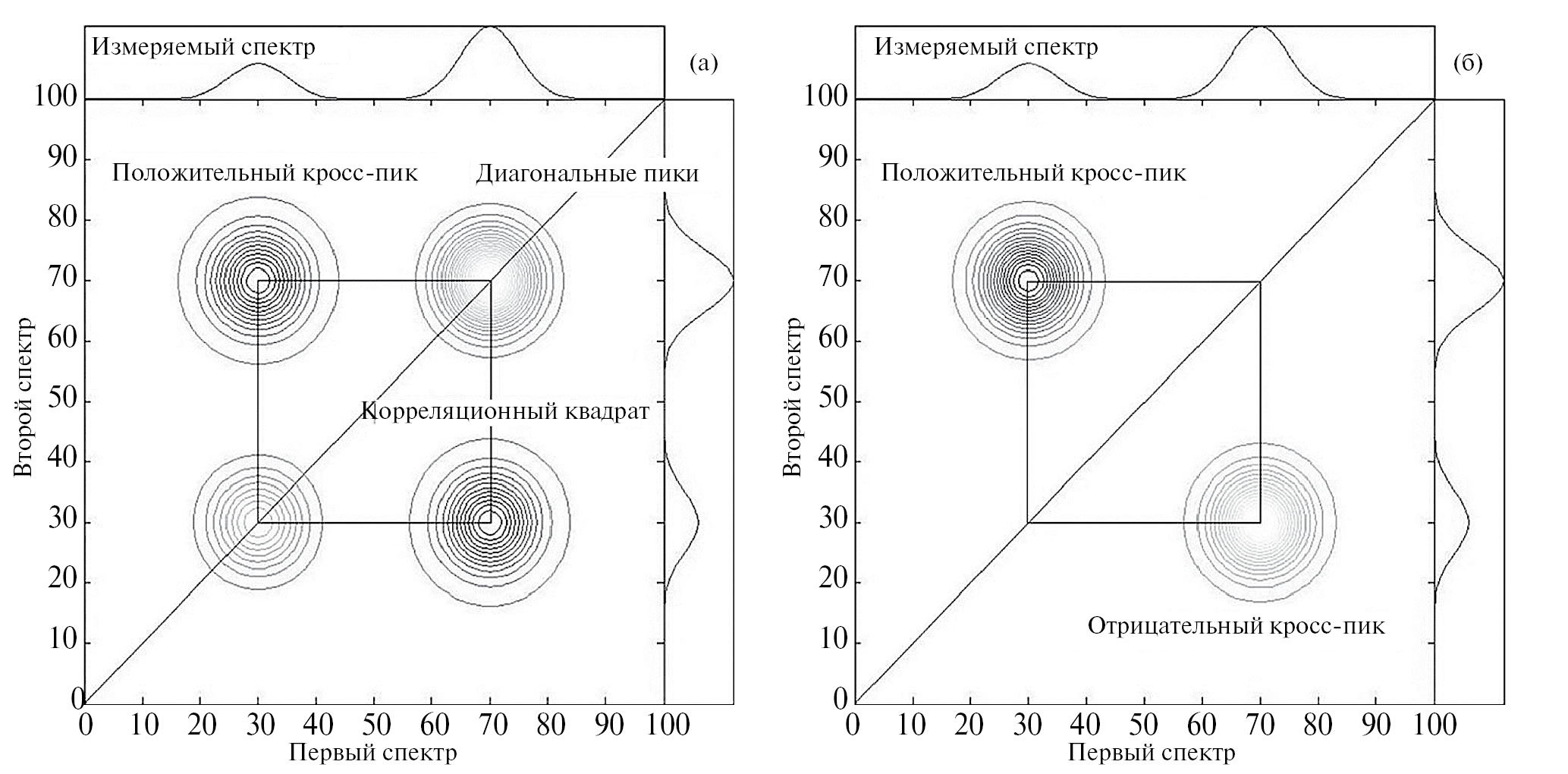 Некоторые основные параметры корреляционных карт отмечены на рис. 4 [47]. Можно видеть диагональные пики в синхронной части и симметричный положительный кросс-пик, что указывает на то, что обе полосы меняются в одном направлении. В асинхронной части нет диагональных пиков, а по отрицательному пику в нижнем правом углу можно сказать, что полоса при значении переменной 70 меняется медленнее, чем полоса при 30 (положительный пик в верхнем левом углу свидетельствует о том же самом). В обоих случаях можно получить корреляционный квадрат, который соединяет все пики, принадлежащие двум коррелирующим полосам в спектрах [47].